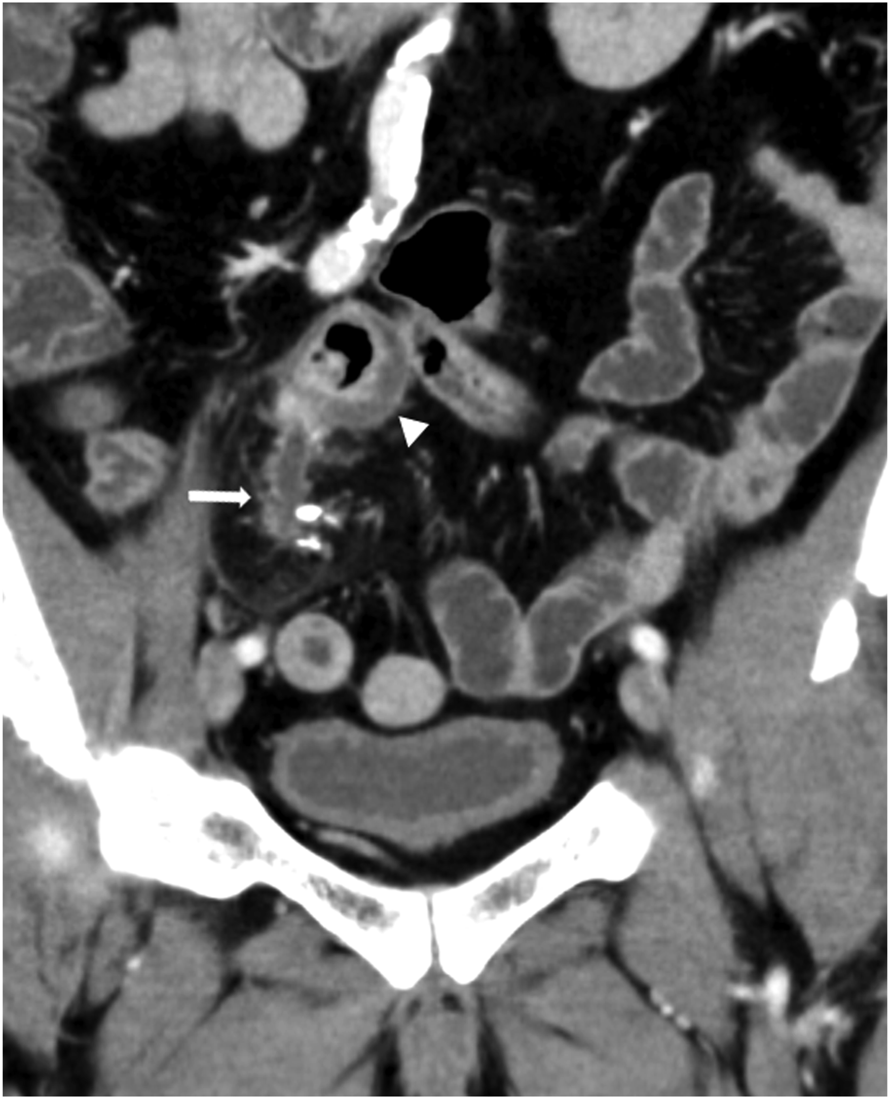 Contrast-enhanced CT was performed, revealing a luminal structure with calcification in the right lower abdomen and an increased fat concentration in the surrounding area, suggesting an acute inflammation (Figure 1, arrow). In addition, the adjacent intestine exhibited edematous wall thickening (Figure 1, arrowhead). We initially considered acute appendicitis, but given that this luminal structure branched from the small intestine and the appendix appeared normal, we ruled out acute appendicitis. Contrast-enhanced computed tomography (CT) image (coronal image, late phase). Luminal structures with calcification are observed in the right lower abdomen (arrow), and edematous wall thickening in the adjacent intestine (arrowhead).