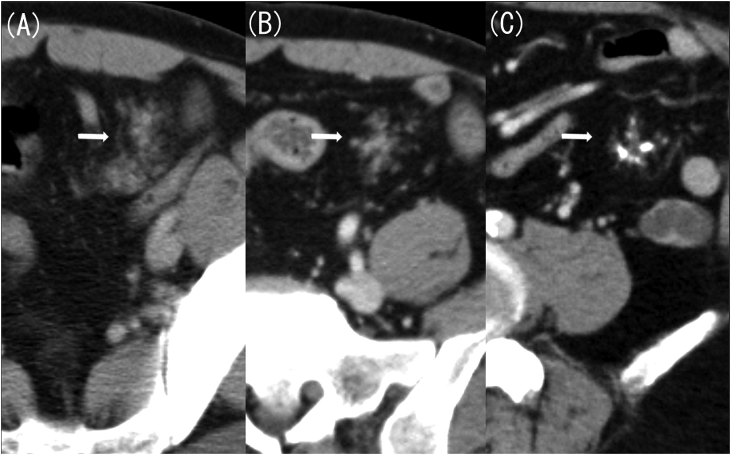 Next, we considered Meckel’s diverticulitis and confirmed the presence of Meckel’s diverticulum on previous CT scans. Contrast-enhanced CT performed 20 years ago revealed a 4 cm-long and 1.5 cm-wide lobulated structure in the left mesentery of the pelvis, resembling the pancreas (Figure 2(a)). CT scan performed 10 years ago showed that this structure had shrunk, appearing similar to an atrophied pancreas (Figure 2(b)). In a CT scan taken 4 years ago, it had further shrunk, with numerous calcifications (Figure 2(c)). The imaging findings were similar to a pancreatitis progressing to a chronic type observed in original pancreas. Additionally, the CT scan taken this time revealed dilatation of the luminal structure that corresponded to the main pancreatic duct (Figure 3(a)) and a stone being confined to the small intestine side (Figure 3(b)). This image finding indicated an acute exacerbation caused by pancreatic stone incarceration that typically occurs in chronic pancreatitis. The location of this structure was in the lower left abdomen on the CT scans taken 20 and 10 years ago, in the left abdomen on the CT scan taken 4 years ago, and in the lower right abdomen on the CT scan taken this time. A CT scan taken 20 years ago showed signs of acute pancreatitis of the native pancreas, including swelling and increased fat concentration in the surrounding area. However, there has been no change in size or shape of the native pancreas since the CT scan taken 10 years ago. (A) Contrast-enhanced computed tomography (CT) image taken 20 years ago (axial image, late phase). (B) Contrast-enhanced CT image taken 10 years ago (axial image, late phase). (C) Contrast-enhanced CT image taken 4 years ago (axial image, late phase). Contrast-enhanced CT taken 20 years ago revealed a pancreas-like lobulated structure measuring 4 cm-long and 1.5 cm-wide located in the left mesentery of the pelvis (A, arrow). Contrast-enhanced CT taken 10 years ago showed that the structure had shrunk, resembling an atrophied pancreas (B, arrow). Additionally, contrast-enhanced CT performed 4 years ago showed that the structure had further shrunk, with numerous calcifications (C, arrow). (A) Contrast-enhanced computed tomography (CT) image taken this time (coronal image, late phase). (B) Contrast-enhanced CT image taken this time (sagittal image, late phase). Compared with the CT result obtained 4 years ago, the luminal structure corresponding to the main pancreatic duct was dilated, with a stone confined to the small intestine side.