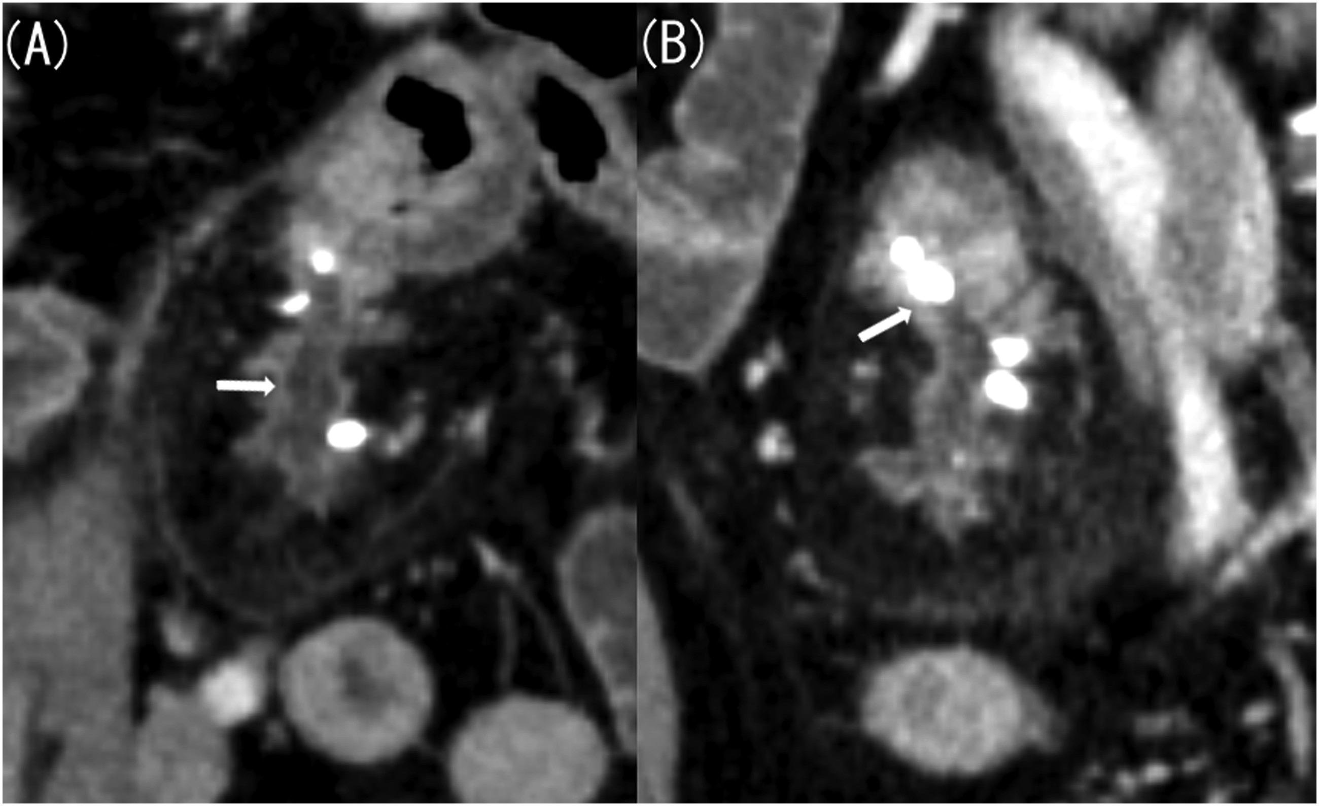 Magnetic resonance cholangiopancreatography (MRCP) taken 10 years ago also confirmed this structure. MRCP clearly depicted the luminal structure that could not be identified on contrast-enhanced CT (Figure 4(a) and (b)). (A) Magnetic resonance cholangiopancreatography (MRCP) image taken 10 years ago. (B) Contrast-enhanced computed tomography (CT) image taken 10 years ago (coronal image, late phase). MRCP clearly depicts luminal structures (A, arrow), but such structures cannot be identified on contrast-enhanced CT (B, arrow).
