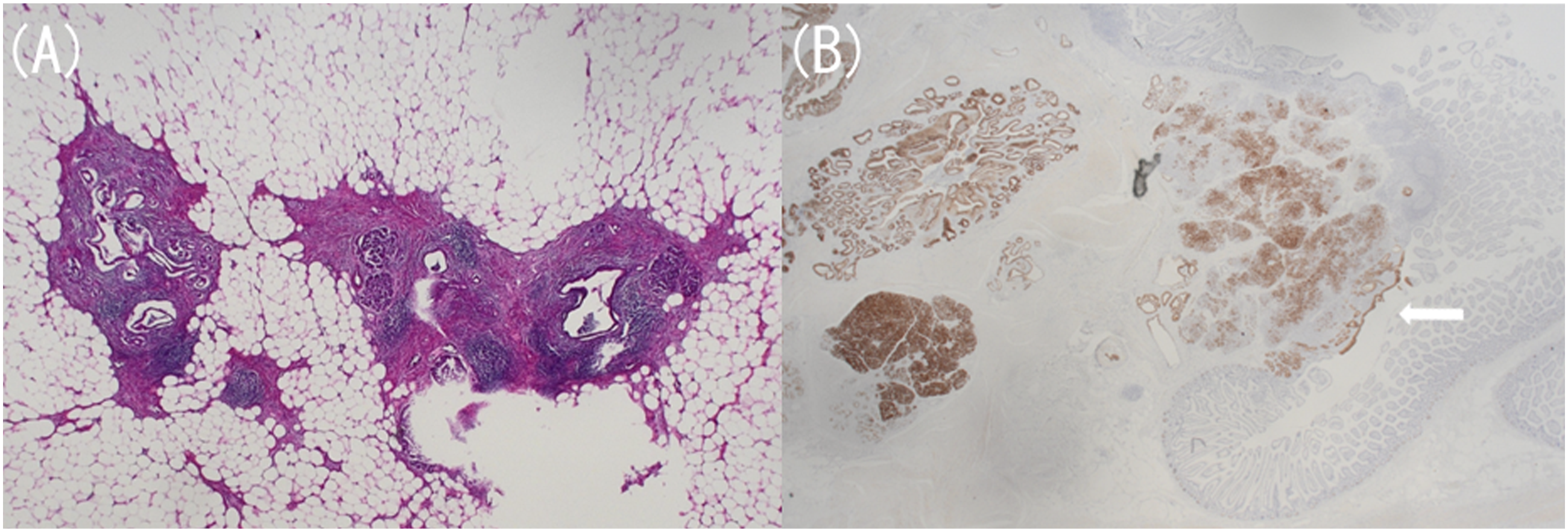 Subsequently, we performed a laparoscopic partial small intestine resection. A camera port was placed in the umbilicus using the open access technique, and the abdominal cavity was observed. A mass was located in the small intestine mesentery 50 cm from the Treitz ligament, and a small laparotomy was performed to remove the small intestine from the abdominal cavity. After confirming that there were no other lesions, we resected the mass measuring 5.4 × 5.0 × 3.5 cm, with the jejunal mesentery as the main site (Figure 5). The mass was not adhered to the surrounding area, and the surgery took 1 h and 30 min. In this site, histopathological findings revealed Heinrich’s type 2 ectopic pancreas, which was composed of ducts and acinar cells, and confirmed chronic and acute pancreatitis (Figure 6(a) and (b)). There were no complications after the surgery, and the patient was discharged 1 week later. The patient has been followed up for 2 years, but the pancreatitis has not recurred. Resected specimen. A mass measuring 5.4 × 5.0 × 3.5 cm was found in the jejunal mesentery. Pathological examination with hematoxylin and eosin staining at low magnification (A) and MUC1 staining (B). According to the Heinrich classification, this ectopic pancreas belonged to type 2, consisting of pancreatic acinar cells and ducts, with findings of pancreatitis (a). Pancreatic acini and ducts are stained within the jejunal mesentery and under the jejunal mucosa, and the pancreatic ductal epithelium is exposed in part of the small intestinal mucosa (B, arrow).