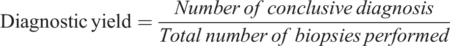 Diagnostic yield was calculated by dividing the number of biopsies with a conclusive histopathological diagnosis by the total number of biopsies performed. This metric was chosen over “diagnostic accuracy” because the retrospective study design did not provide a systematic reference standard (e.g., surgical follow-up) for all patients, which is required to calculate sensitivity and specificity.