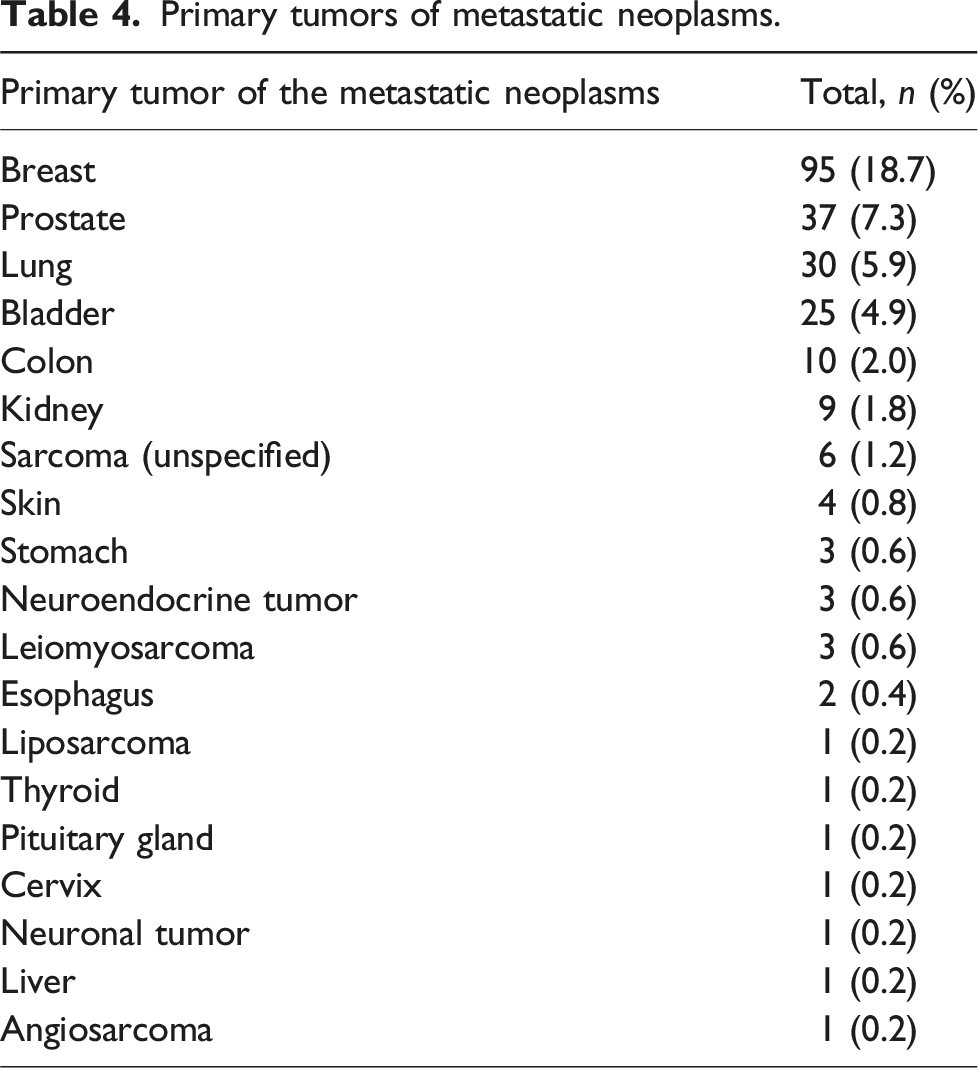 In our study, the most prevalent tumor type was metastatic lesions, followed by benign conditions, consistent with recent findings in comparable studies.13,14,17,18 Although studies by Maciel et al. and Rimondi et al. reported varying frequencies of benign lesions and primary malignant neoplasms,19,20 they all consistently identified breast, prostate, and lung cancer as the most common primary tumors associated with metastatic lesions.13,14,17–20