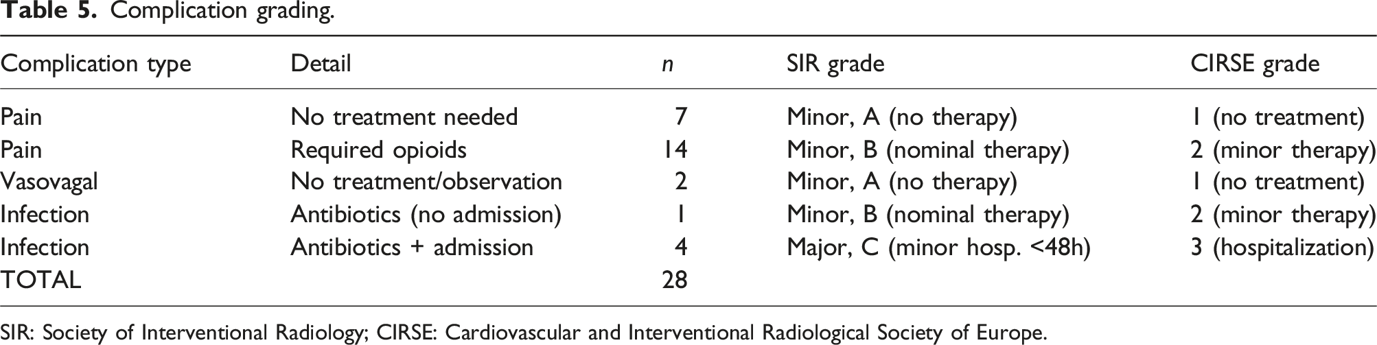 Our complication rate of 5.5% aligns with the rates reported in related studies. Rimondi et al. reported a complication rate of 1.1%, 20 Maciel et al. and Harris et al. 1.6%,14,19 Rehm et al. 2.8%, 18 Monfardini et al. 3.5%, 17 and Baffour et al. 5.6%. 13 However, the definition of a complication varies across studies. For instance, not all studies consider procedural site pain a complication. In our study, as in those by Monfardini et al. and Baffour et al., complications were classified according to the SIR complication classification system, 15 which may explain the relatively higher complication rates in these studies. Several studies did not use a formal classification system14,18–20; only Rehm et al. considered pain a complication. 18 Pain significantly contributed to the complication rates in both the literature and our study, influencing overall rates. Therefore, implementing a standardized classification system, such as SIR or CIRSE, is essential for accurately documenting complications. Excluding pain could lead to an underestimation of the actual complication rate.