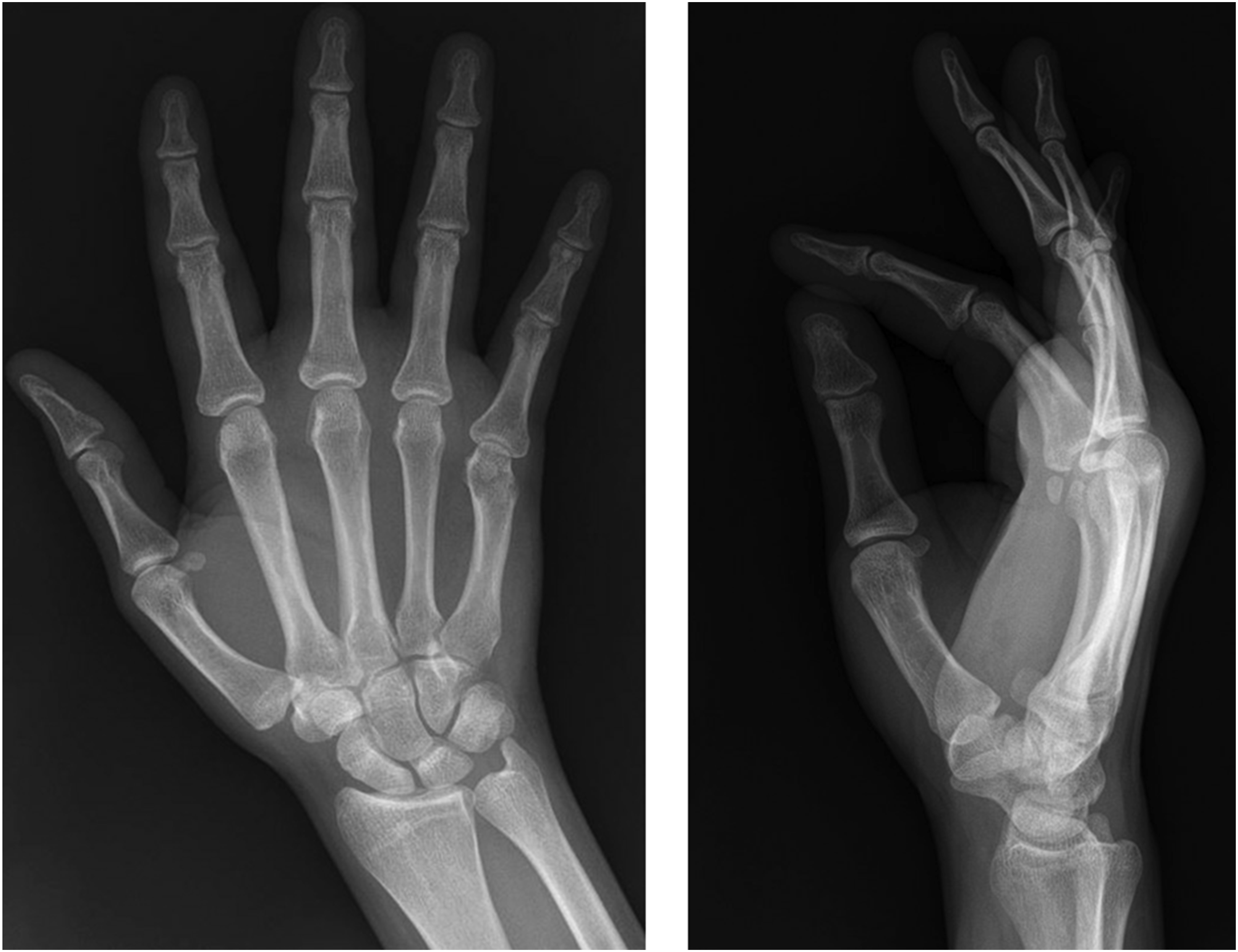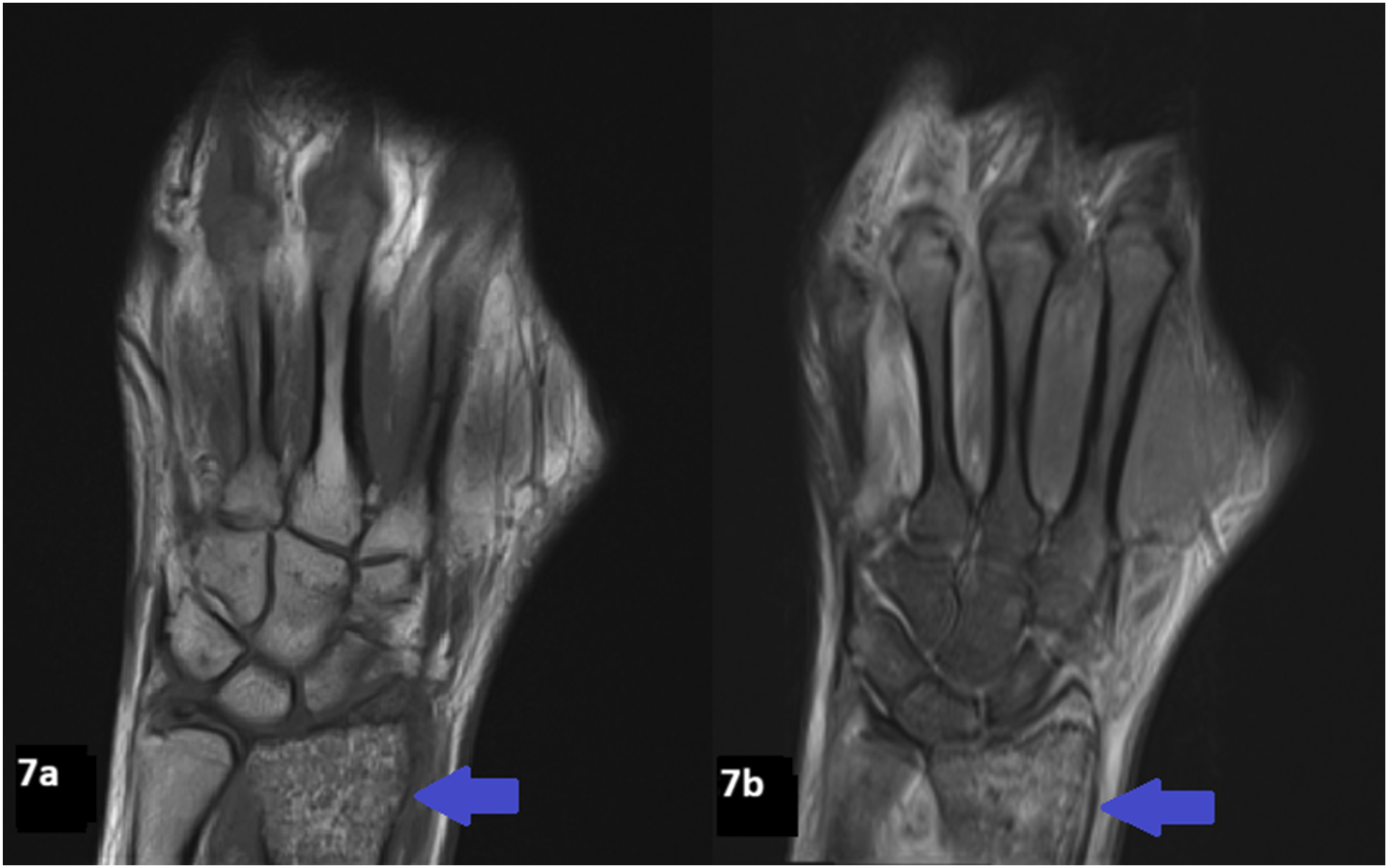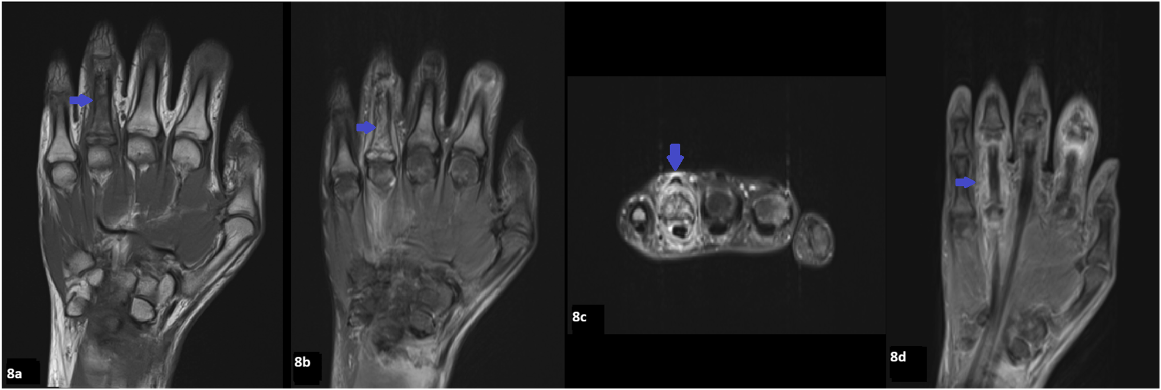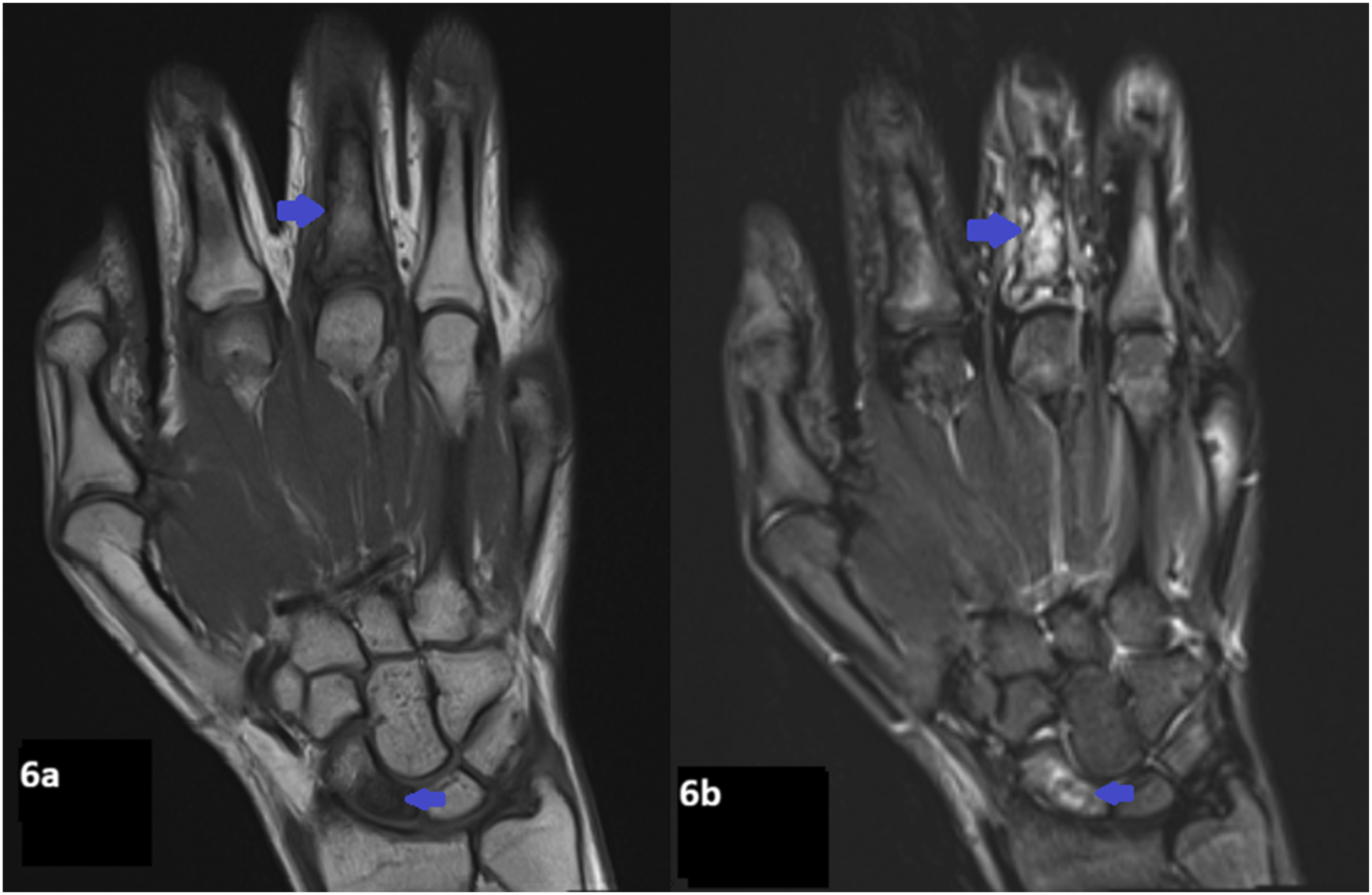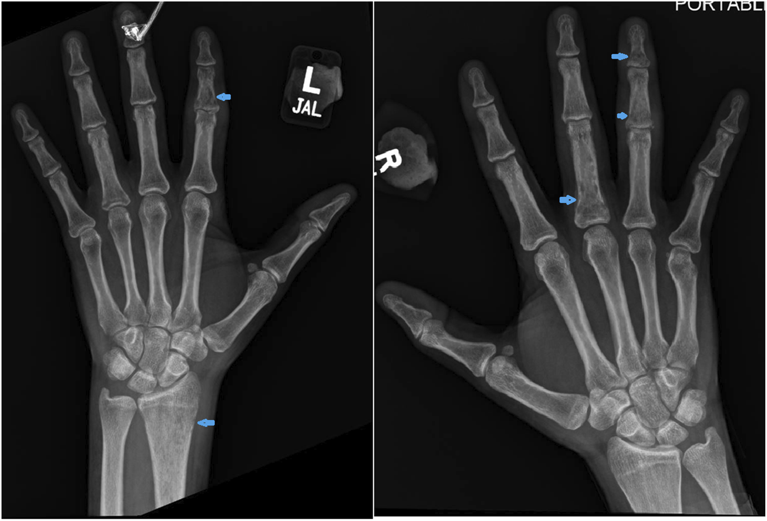 Radiographs of the hands revealed multifocal permeative lucencies involving the distal radius and multiple phalanges (Figure 5), raising concern for systemic arthropathy or osteomyelitis. MRI of the hands showed bone marrow signal abnormalities consistent with multiple bone infarcts (Figures 6–8). Radiographs of the hand showing permeative lytic lesions involving left distal radius and multiple phalanges (blue arrows). (a) Coronal T1W and (b) Coronal STIR MRI of the right hand reveals bone infarcts at the scaphoid and middle finger proximal phalanx. (a) Coronal T1W and (b) STIR MRI of the left hand demonstrates patchy T1 hypointense signal and STIR hyperintense signal abnormality at the distal radius representing ischemic changes. (a) Coronal T1W, (b) Coronal STIR, (c) Axial STIR, and (d) Post contrast T1FS of the left hand demonstrates bone infarct at the ring finger proximal phalanx, and soft tissue edema and enhancement.