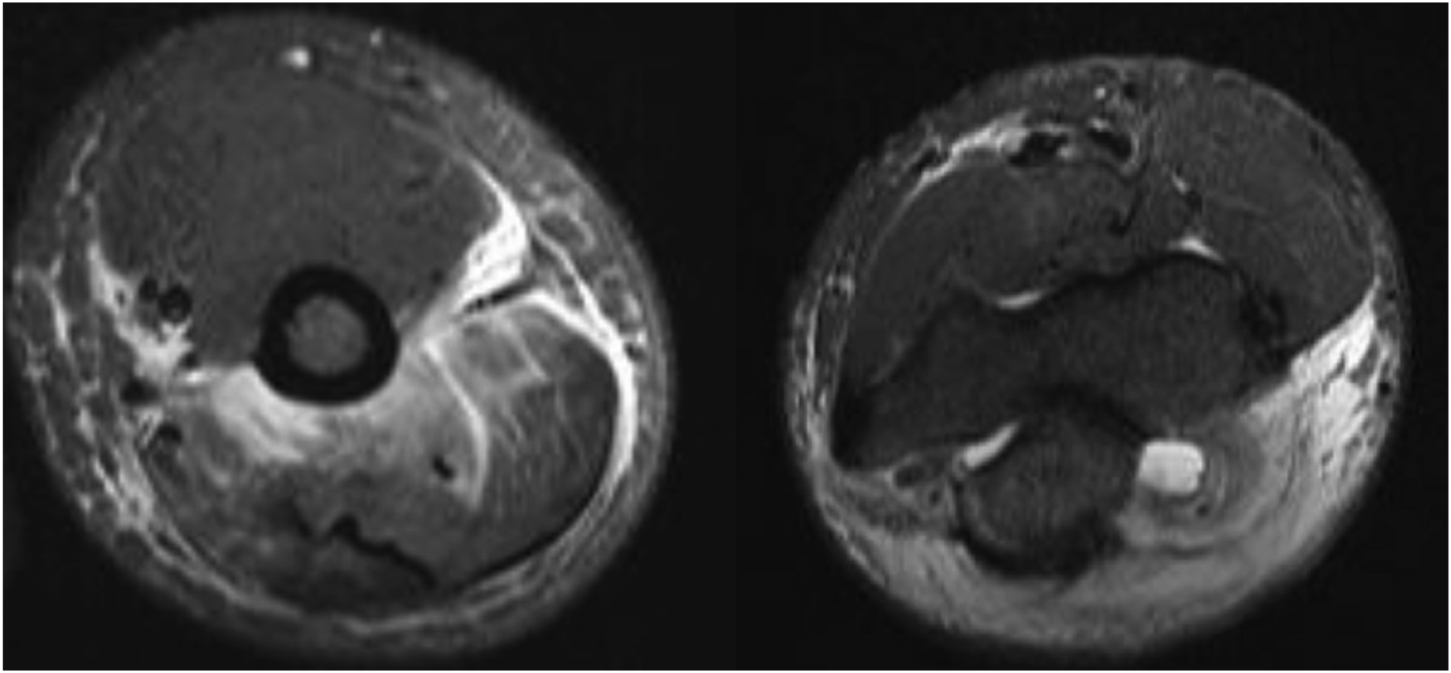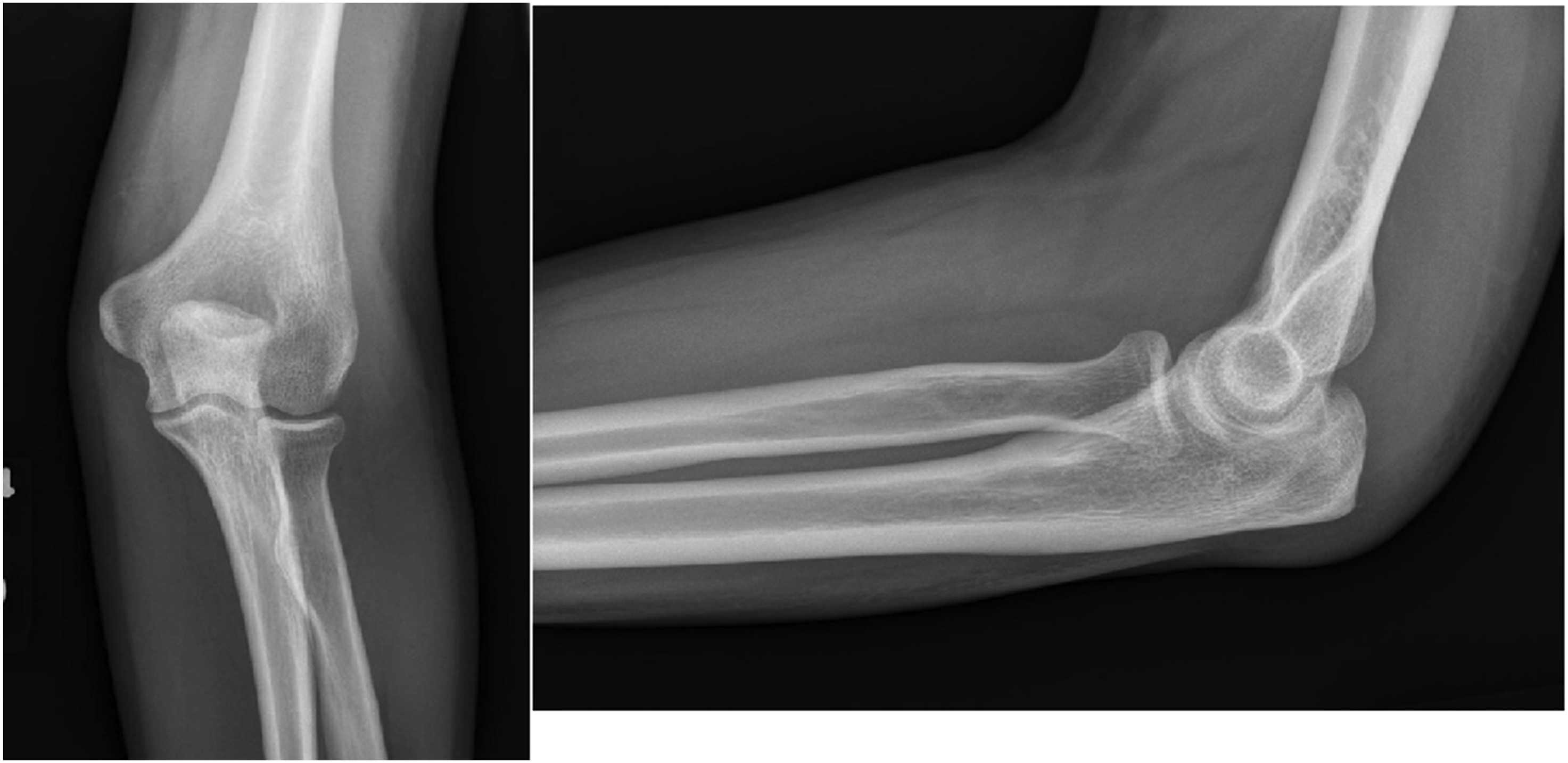 Two months later, he developed new-onset migratory polyarthritis involving the left elbow, bilateral ankles, knees, and small joints of both hands. At this time, the patient did not have any abdominal symptoms. Physical examination revealed joint swelling and tenderness. Radiographs of the right hand (Figure 1) and left elbow (Figure 2) obtained at this time demonstrated only soft tissue swelling, with no radiographic evidence of erosive or inflammatory arthritis, focal bone lesions, or bone infarction. MRI of the left elbow showed posterior subcutaneous and soft tissue edema with associated triceps muscle edema, a small joint effusion and mild bone marrow edema at the olecranon process (Figure 3). Synovial fluid aspirated from the left elbow showed mildly elevated white blood cell count (3000 cells/mm3), but Gram stain, culture, and crystal analysis were negative. Laboratory tests showed elevated ESR and CRP, normal serum uric acid, creatine kinase, and complement (C3 and C4) levels. Antinuclear antibody and rheumatoid factor were negative. Urine tests for Radiographs of the right hand demonstrating soft tissue swelling predominantly about the metacarpophalangeal joints. No osseous erosions, no focal lytic or sclerotic bone lesion. Radiographs of the left elbow demonstrating mild soft tissue swelling at the posterior elbow. No osseous abnormalities. Axial STIR MR images of the left elbow demonstrate subcutaneous edema, triceps muscle edema, small joint effusion and mild bone marrow edema at the olecranon process.