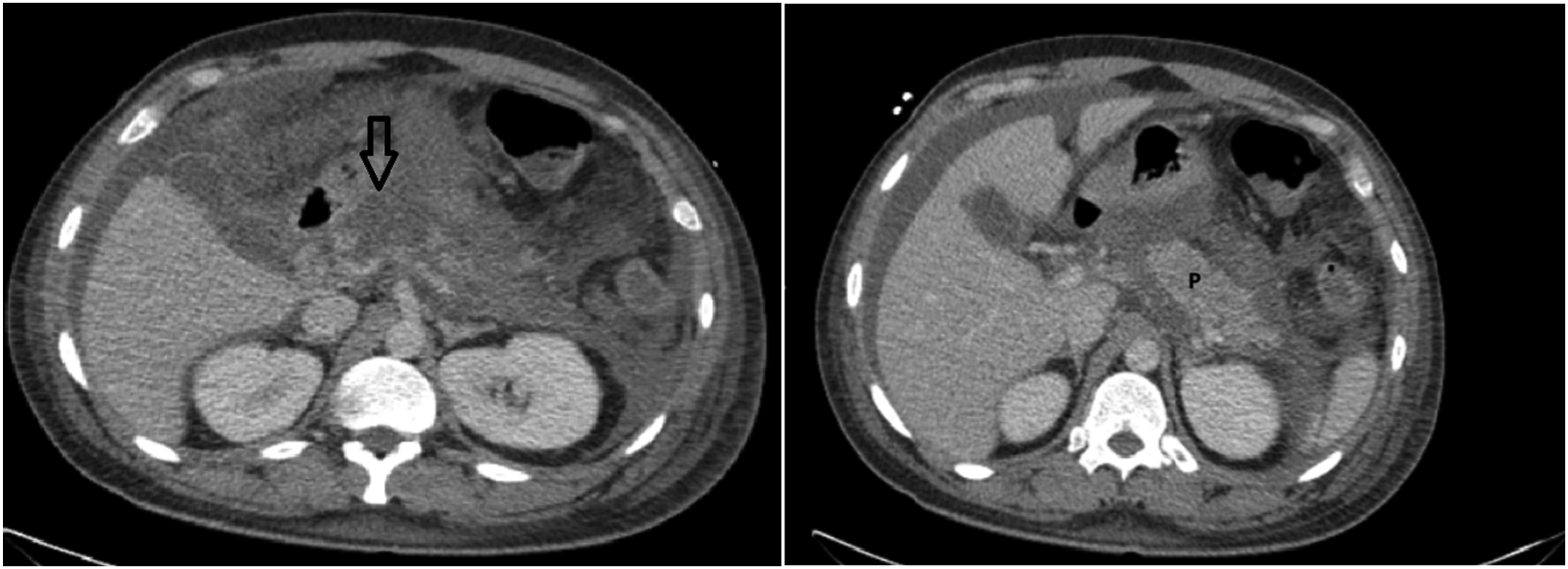 One month later, the patient was readmitted with recurrent abdominal pain, vomiting, fever, and worsening joint symptoms. Examination revealed multiple tender, erythematous subcutaneous nodules over both shins. Serum lipase was markedly elevated (15,000 U/L). Repeat CT of the abdomen revealed extensive pancreatic necrosis with peripancreatic fluid collections (Figure 4). Axial contrast–enhanced CT abdomen demonstrating pancreatic head necrosis (arrow), bulky pancreatic body (P), peripancreatic fluid and ascites.