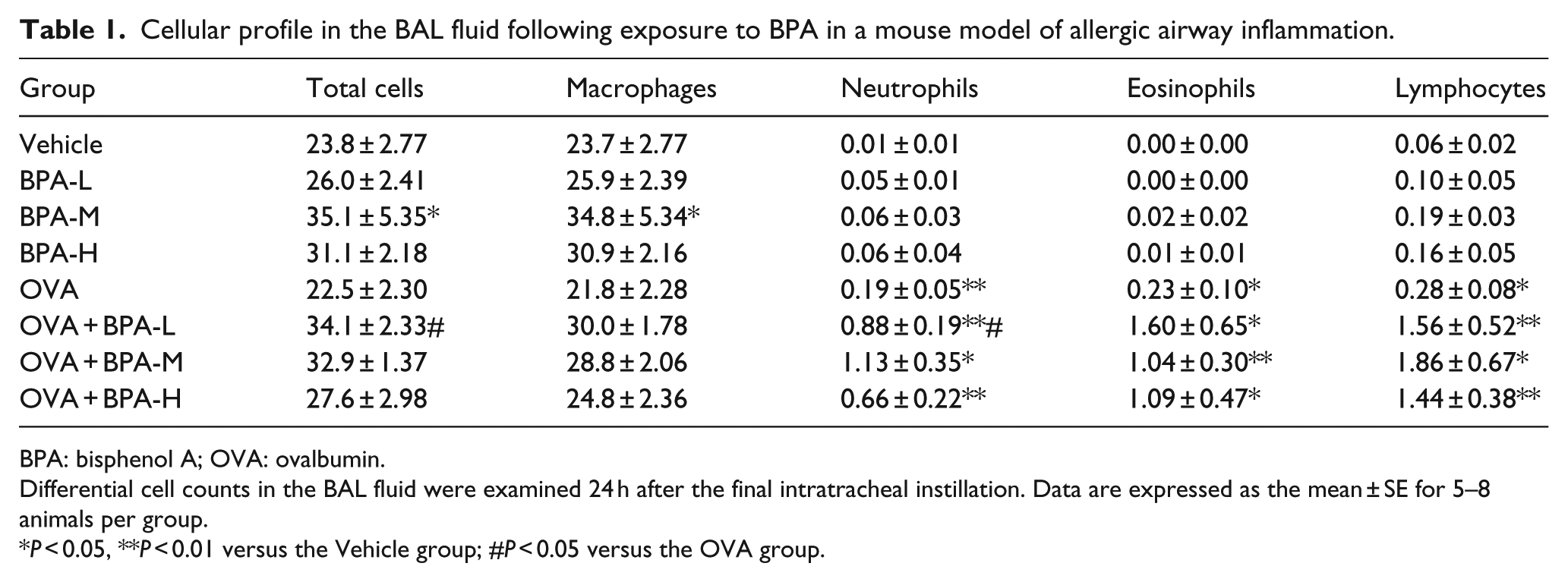 Cellular profile in the BAL fluid following exposure to BPA in a mouse model of allergic airway inflammation.