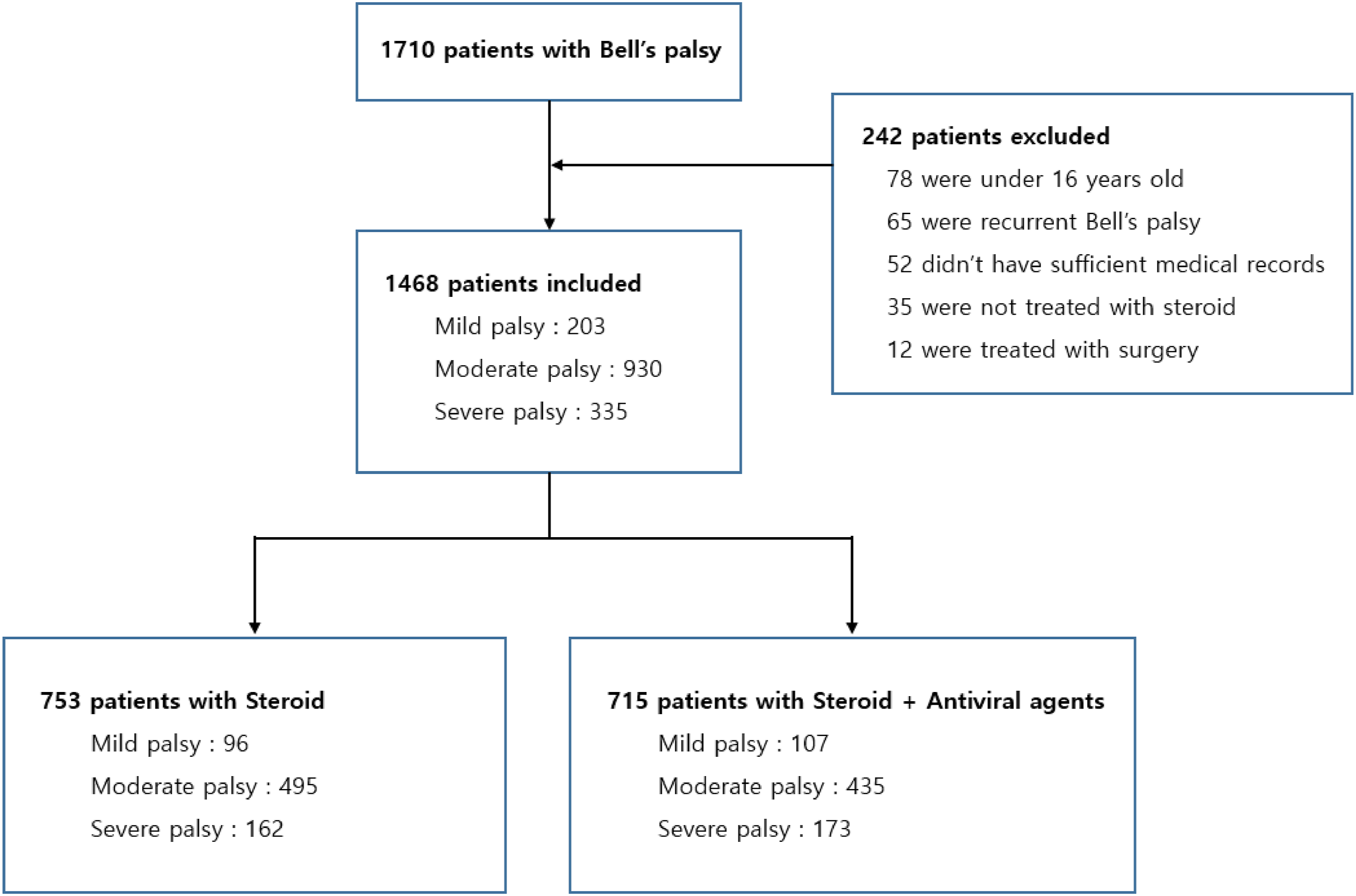 From January 2005 to December 2019, the records of 1710 Bell’s palsy patients who visited Kyung Hee University Hospital were reviewed retrospectively. Of these, 335 (19.6%) patients were diagnosed with severe Bell’s palsy, with 162 patients treated with steroids alone and 173 patients treated with combinations of steroids and antiviral agents. The outcomes of treatment were assessed using the House–Brackmann (H-B) grade according to age, sex, hypertension, diabetes, and obesity.