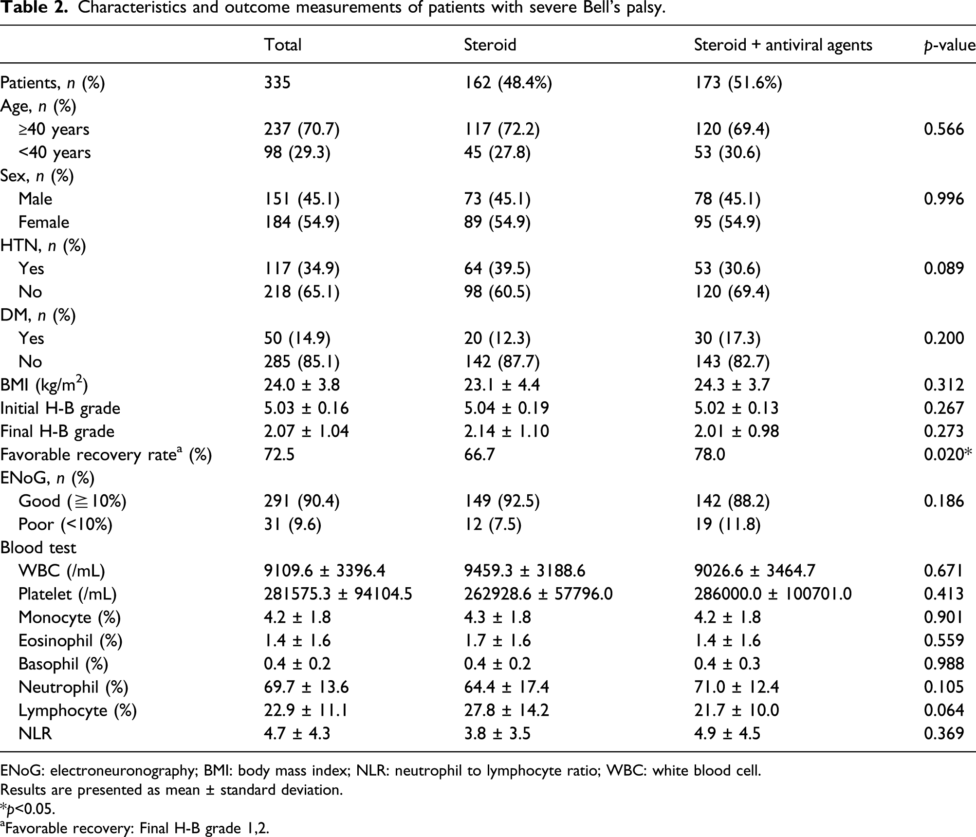 During the study period, a total of 1710 patients were diagnosed with Bell’s palsy. Of these, 242 were excluded because they were aged < 16 years, had recurrent Bell’s palsy, had insufficient medical records (unclear time of onset or follow-up for <6 months after onset), had not received steroid treatment, had undergone surgical treatment for Bell’s palsy, or had uncontrolled hypertension or diabetes. Of the 1468 patients included, 753 (51.3%) were treated with steroids alone and 715 (48.7%) with steroids plus antiviral agents (Figure 1). At the onset of facial paralysis, 203 patients (13.8%) had mild palsy (H-B grade 2), 930 (63.4%) had moderate palsy (H-B grade 3–4), and 335 (22.8%) had severe palsy (H-B grade 5–6). These three groups differed significantly in their initial H-B grade (2.00 ± 0.00 vs 3.51 ± 0.50 vs 5.03 ± 0.16, Overview of patient enrollment. Mild palsy, initial H-B grade 2; moderate palsy, initial H-B grade 3,4; severe palsy, initial H-B grade 5,6. H-B grade, House–Brackmann grade. Demographic and clinical characteristics of patients with Bell’s palsy. BMI: body mass index; HTN: hypertension; DM: diabetes mellitus; H-B grade: House–Brackmann grade; ENoG: electroneuronography; WBC: white blood cell; NLR: neutrophil to lymphocyte ratio. Results are presented as mean ± standard deviation. * aMild palsy, initial H-B grade 2; moderate palsy, initial H-B grade 3,4; severe palsy, initial H-B grade 5,6.