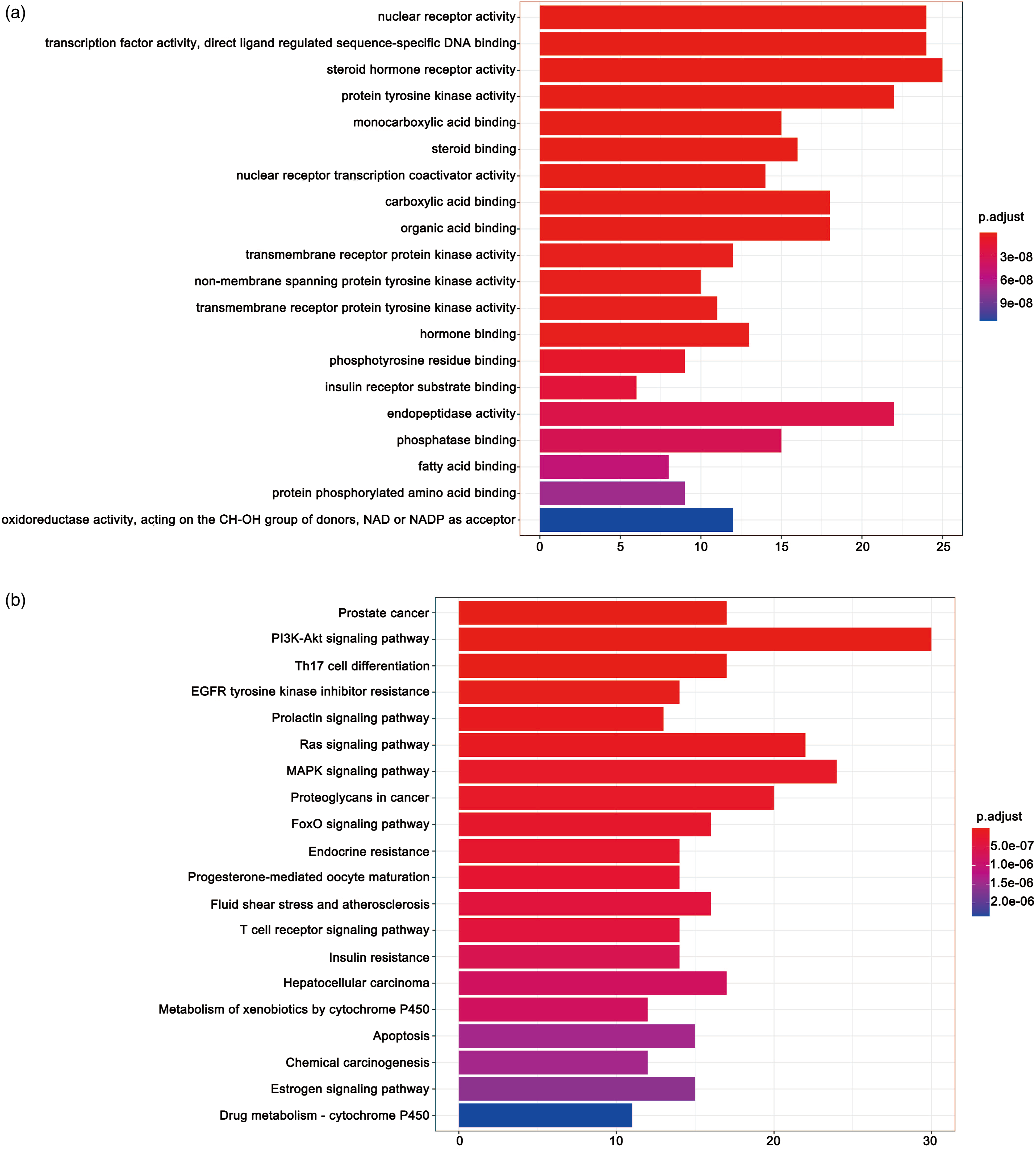 The key proteins could regulate 170 biological processes, primarily containing steroid hormone receptor activity, nuclear receptor activity, transcription factor activity, direct ligand regulated sequence-specific DNA binding, protein tyrosine kinase activity, endopeptidase activity, carboxylic acid binding, and organic acid binding. Figure 3(a) shows the top 20 biological processes. Regarding pathway analysis, the key proteins were involved in 126 signaling pathways, primarily the PI3K-Akt signal pathway, MAPK signaling pathway, Ras signaling pathway, proteoglycans in cancer, prostate cancer, Th17 cell differentiation, and hepatocellular carcinoma. Figure 3(b) shows the top 20 pathways. (a) GO enrichment analysis. The larger the bar chart is, the higher the enrichment degree of each biological processes, and the color of the bar plot map represents the gene enrichment of each biological processes. (b) KEGG enrichment analysis. The larger the bar plot diagram, the higher the enrichment degree of each KEGG pathway, and the color of the bar plot map represents the gene enrichment of each KEGG pathway.