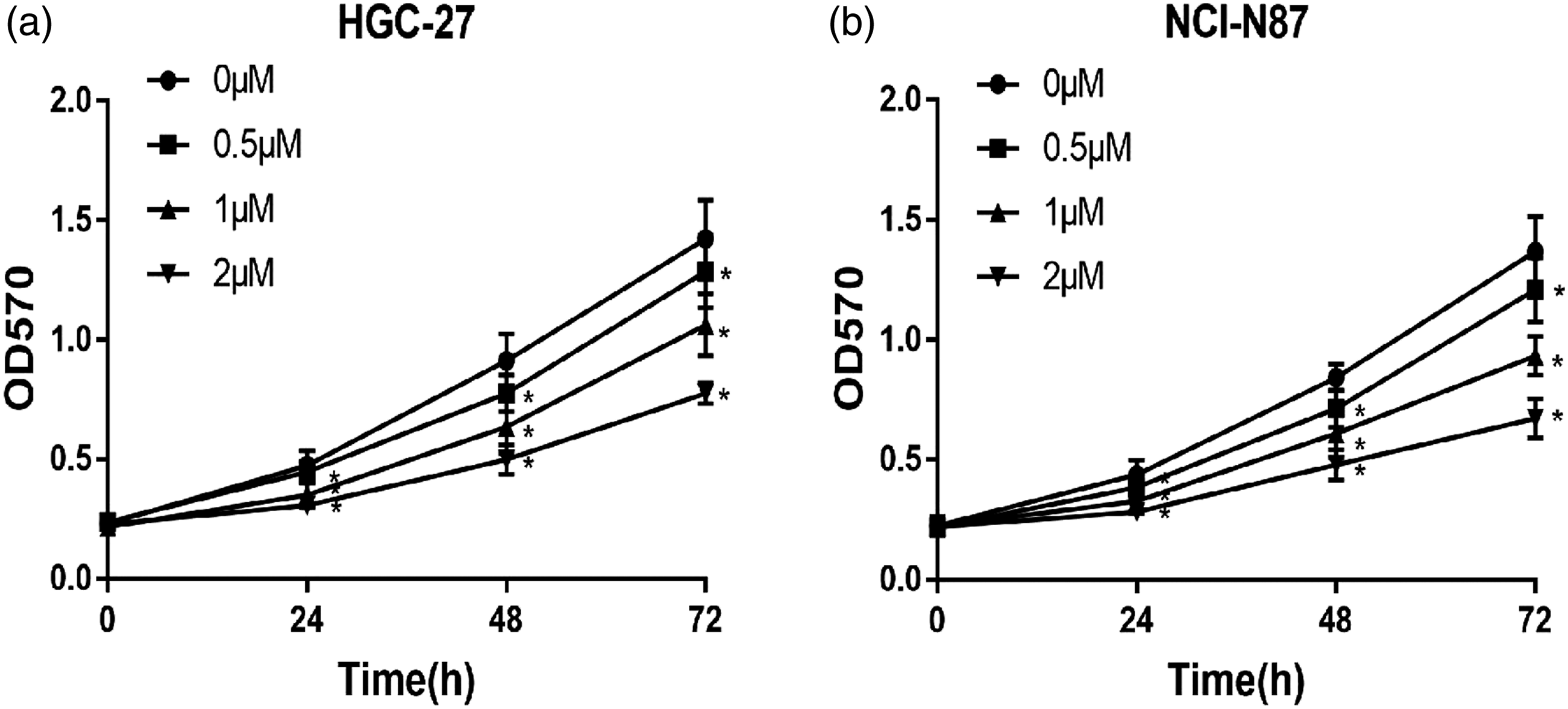 The effect of TRX on the viability of GC cells was detected by MTT assay. HGC-27 cells and NCI-N87 cells were treated with various concentrations of TRX for 24 h, 48 h, and 72 h, respectively. We observed a time-dependent and concentration-dependent decrease in cell viability. Additionally, the cell survival rate in the TRX-treated group was significantly lower than that in the control group (Figure 4). These results indicated that TRX suppressed GC cell viability. Effect of TRX on cell proliferation. (a) HGC-27 and (B) NCI-N87 cells were treated with various concentrations of TRX (0, 0.5, 1, and 2 µM) for 24 h, 48 h, and 72 h, and cell viability was measured by MTT assay. (