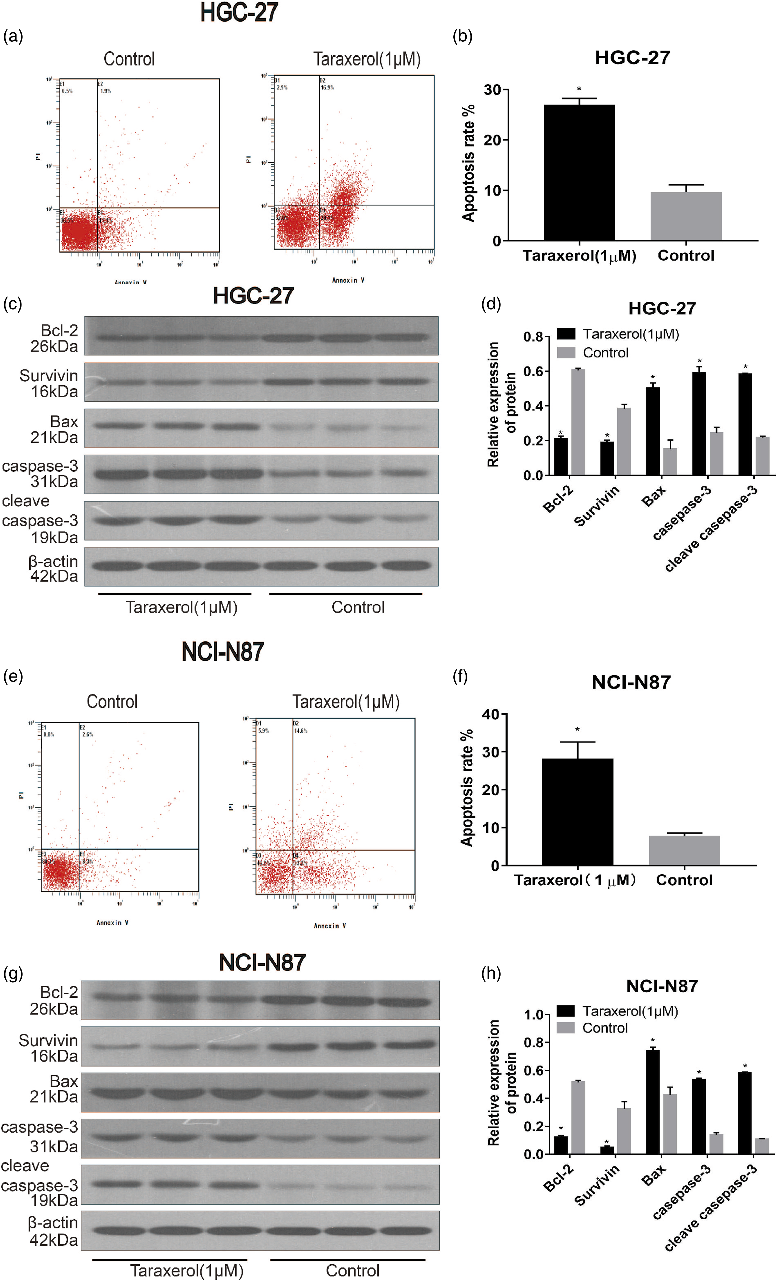 The above results showed that 1 μM TRX inhibited GC cell proliferation. Therefore, we used a 1 μM dose of TRX in subsequent experiments. Next, we studied the influence of TRX on apoptosis of GC cells by flow cytometry. These results indicated that the apoptosis rates of TRX-treated HGC-27 and NCI-N87 cells were significantly higher compared with the control group (Figure 5(a)–(b), (e)-(f)). Next, we measured the expression of apoptosis-related proteins in GC cells treated with TRX for 24 h by Western blot to explore the molecular mechanism of TRX-treated GC cell apoptosis (Figure 5(c) and (d), (g)–(h)). The results indicated that the levels of Bcl2 and survivin in the TRX group were lower than those in the control group. The expression of caspase-3, cleaved caspase-3, and Bax in the TRX group was significantly higher compared with the control group. These results suggested that TRX induced GC cell apoptosis. Cell apoptosis by TRX. Flow cytometry analysis of (a) HGC-27 cells and (E) NCI-N87 cells. The overall rates of apoptosis increased significantly after TRX treatment (b and f). HGC-27 (C and D) and NCI-N87 (g and h) cells were treated with TRX for 24 h and subjected to Western blot with Bcl-2, Bax, cleaved caspase3, caspase-3, and survivin antibodies. *