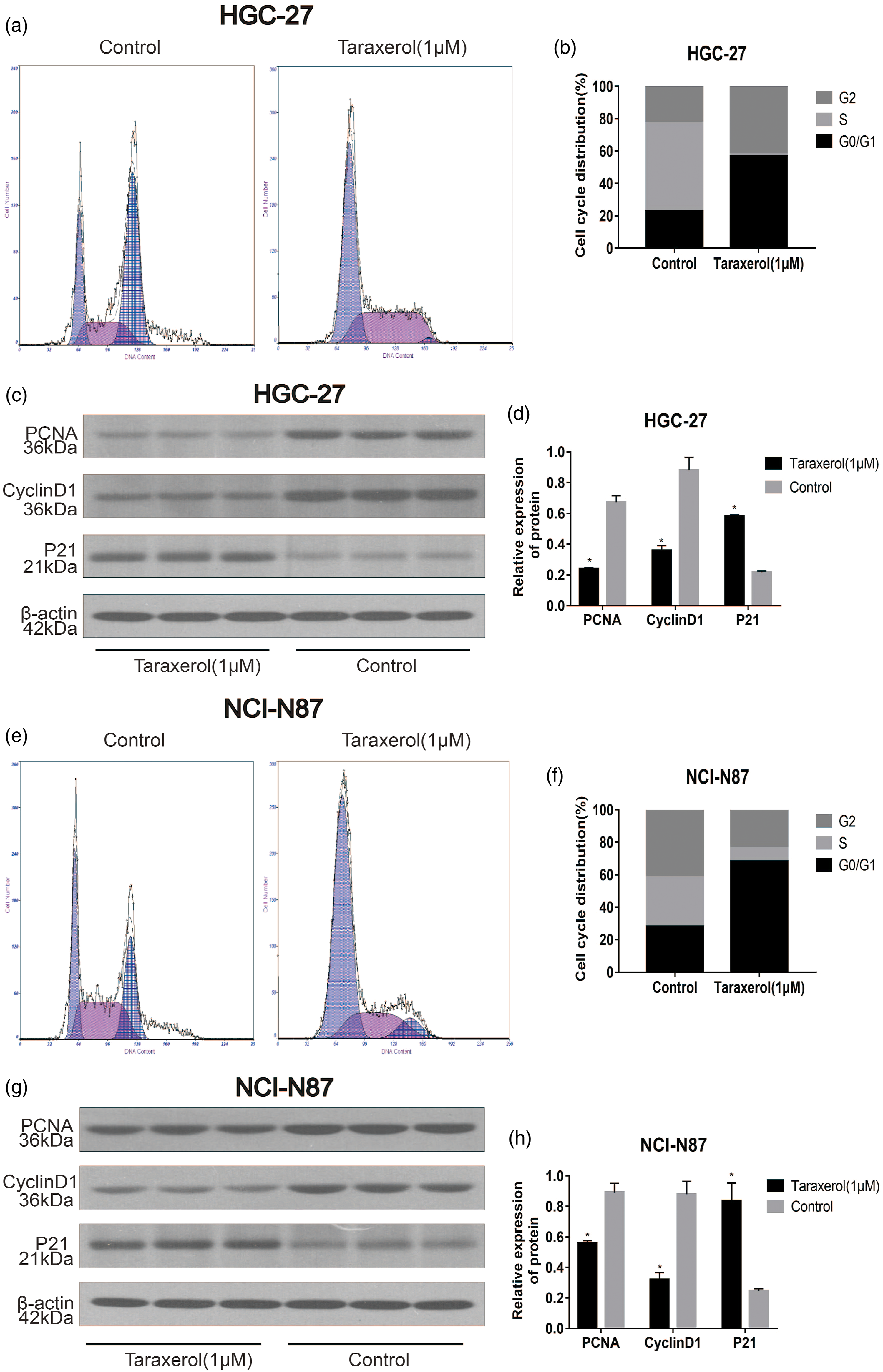 Flow cytometry was applied to investigate the number of GC cells in each phase of the cell cycle to identify the ability of TRX to induce cell cycle arrest. We observed that the number of cells in the G0/G1 phase in the TRX group was significantly higher than that in the control group (Figure 6(a)–(b), (e)–(f)). Additionally, we also used Western blot to detect the changes in the expression of related proteins after 24 h of treatment with TRX. The results showed significantly downregulated levels of Proliferating Cell Nuclear Antigen (PCNA) and CyclinD1 and significantly upregulated levels of p21 in the TRX group (Figure 6(c) and (d), (g)–(h)). These data suggested that TRX induced cell cycle arrest in G0/G1 phase, which affected the proliferation of GC cells. Cell cycle analysis revealed that TRX arrested cell growth at the G0/G1 phase. (a) HGC-27 and (e) NCI-N87 cells were incubated with the indicated dose of TRX for 24 h, stained with Propidium iodide, and DNA content of (b) HGC-27 and (f) NCI-N87 cells was detected via flow cytometry. HGC-27 (c–d) and NCI-N87 (g–h) cells were treated with TRX for 24 h and subjected to Western blot with PCNA, p21, and cyclin D1 antibodies.