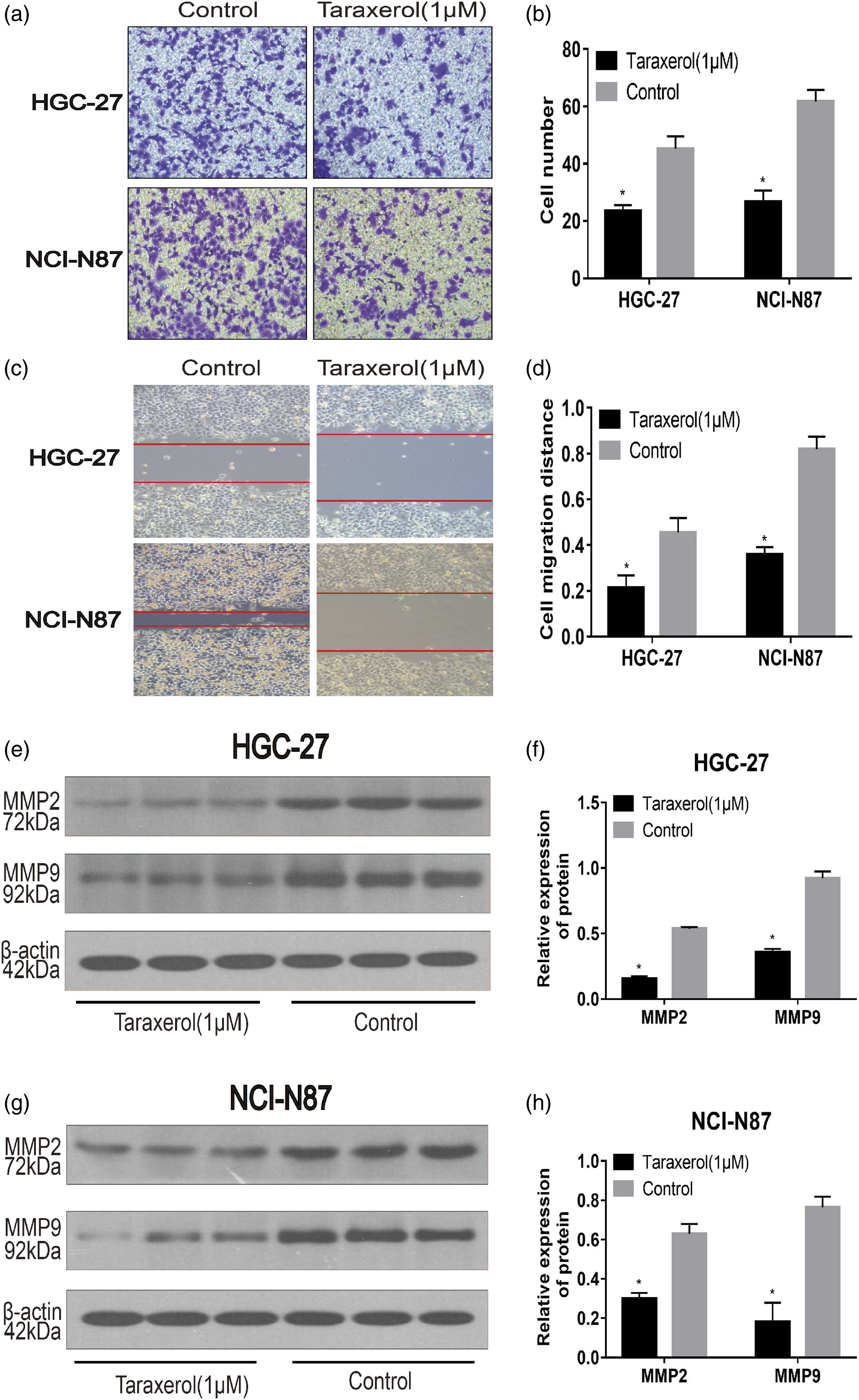 The anti-metastatic effect of TRX on GC cells was observed by wound healing assay. We observed significantly lower cell migration in the TRX group compared with the control group (Figure 7(c) and (d)). The effects of the Transwell assay indicated that the number of transmembrane cells in the TRX group was significantly less than that in the control group (Figure 7(a) and (b)). Additionally, we applied Western blot to study the expression of related proteins after 24 h of treatment with TRX. The results indicated significantly downregulated levels of MMP2 and MMP9 in the TRX group (Figure 7(e)–(h)). Thus, TRX inhibited the migration and invasion of GC cells. TRX inhibited the migration and invasion of HGC-27 and NCI-N87 cells. (a–b) Transwell assay was applied to determine the effect of TRX on cell invasion. (c–d) Effects of TRX on the migration of HGC-27 and NCI-N87 cells via wound healing assay. Western blot analysis of MMP2 and MMP9 in HGC-27 (e–f) and NCI-N87 (g–h) cells.