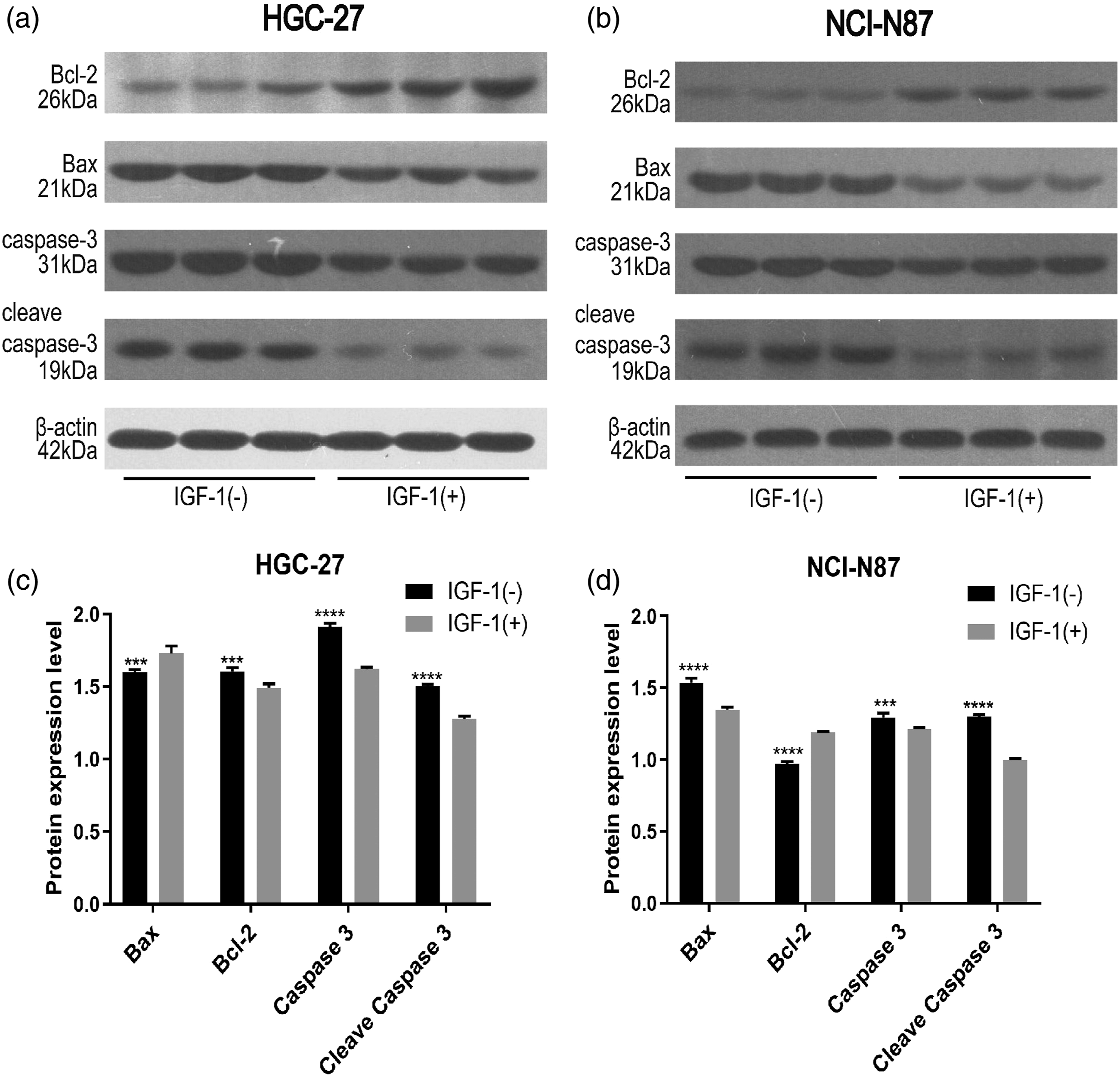 We analyzed the effect of TRX on PI3K-AKT pathway in GC cells. The results of Western blot analysis showed that TRX treatment resulted in significantly decreased protein expression of PI3K, p-PI3K, and p-AKT, while there was no effective change in the protein expression of AKT (Figure 8). It is suggested that PI3K/Akt pathway is involved in the process of apoptosis induced by TRX in GC cells. After further intervention with PI3K/Akt agonist IGF-1, Western bolt results (Figure 9) showed that the pro-apoptotic effect of TRX was inhibited. Effects of TRX on the expression of PI3K/AKT pathway proteins in HGC-27 (a and c) and NCI-N87 (b and d) cells. Western blot analysis of Bcl-2, Bax, cleaved caspase3, and caspase-3 expression in HGC-27 (a and c) and NCI-N87 (b and d) cells treated with TRX in the presence or absence of IGF-1.