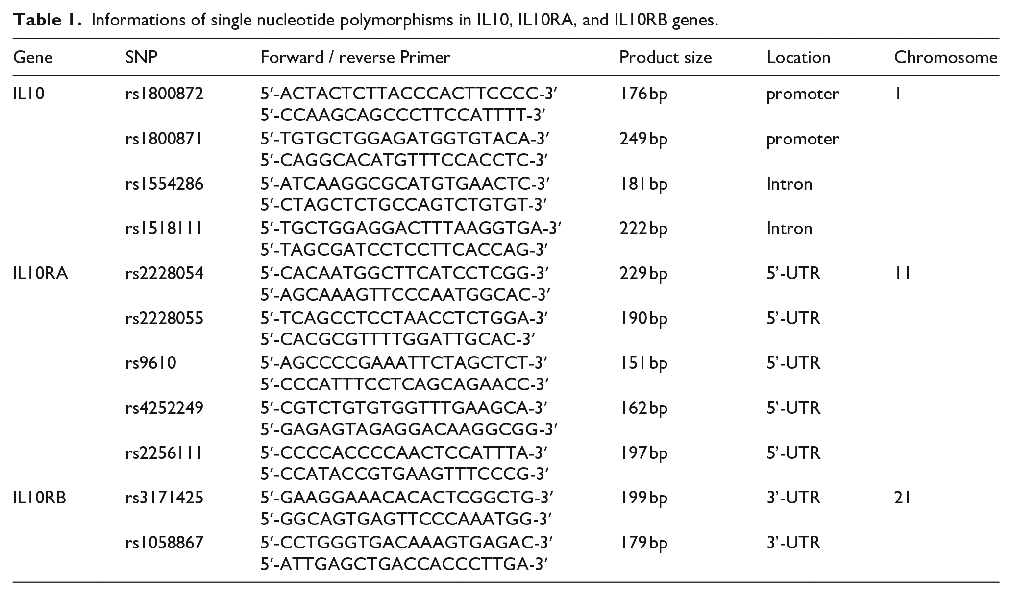 Informations of single nucleotide polymorphisms in IL10, IL10RA, and IL10RB genes.