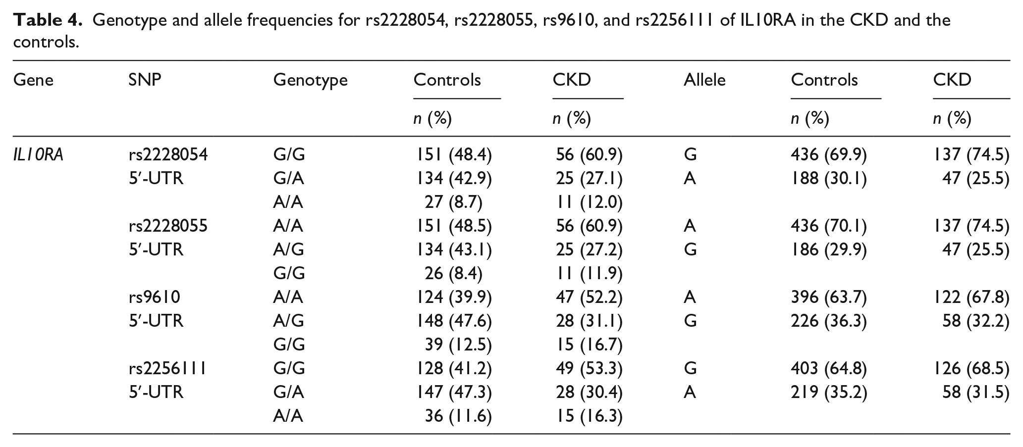 Genotype and allele frequencies for rs2228054, rs2228055, rs9610, and rs2256111 of IL10RA in the CKD and the controls.