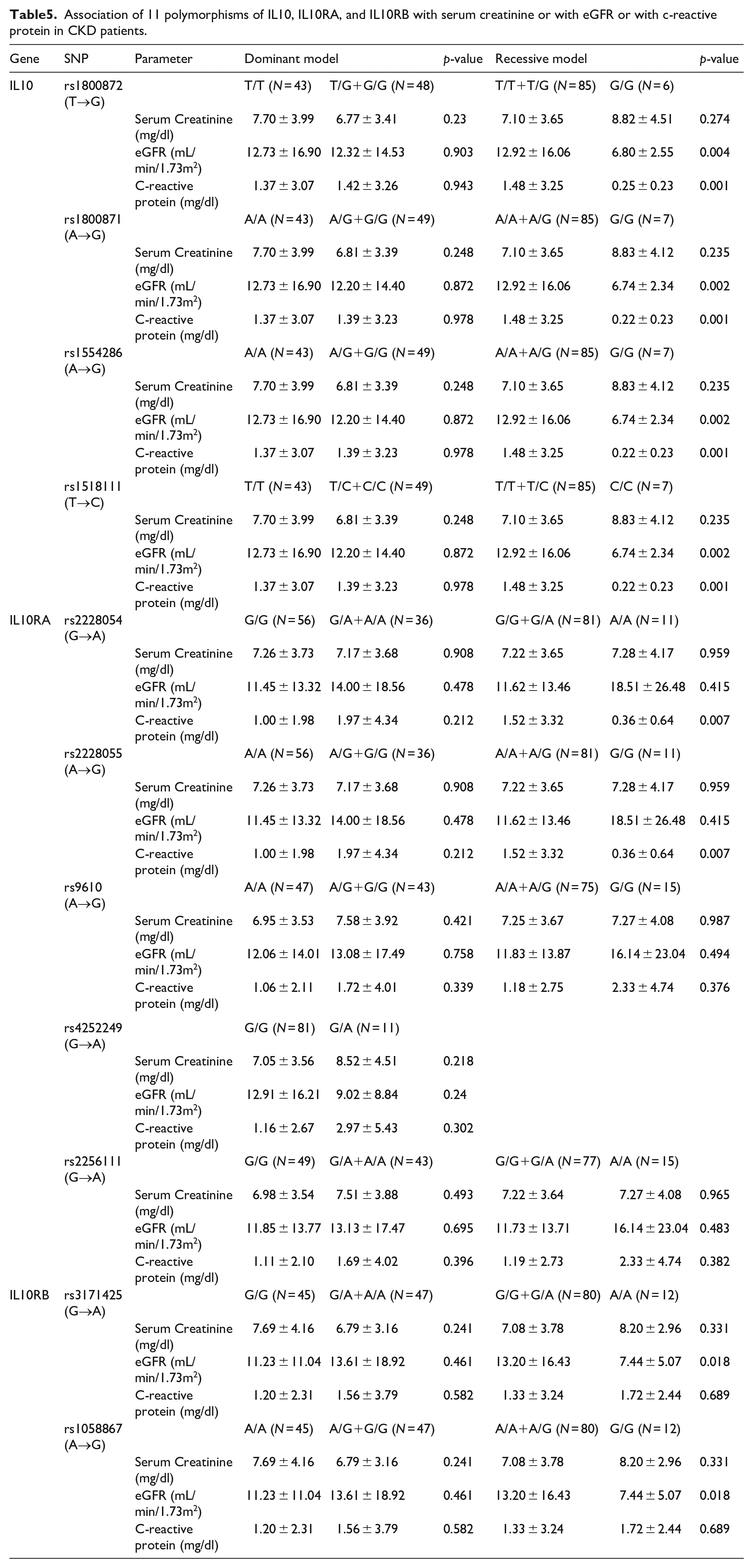 Association of 11 polymorphisms of IL10, IL10RA, and IL10RB with serum creatinine or with eGFR or with c-reactive protein in CKD patients.