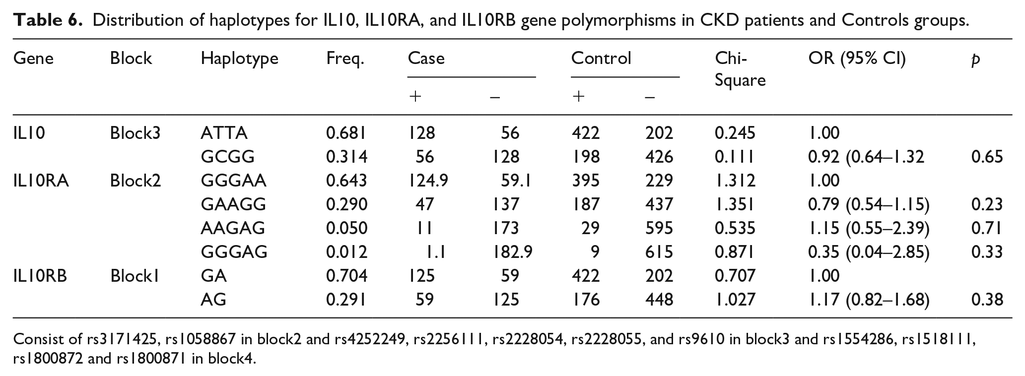 Distribution of haplotypes for IL10, IL10RA, and IL10RB gene polymorphisms in CKD patients and Controls groups.