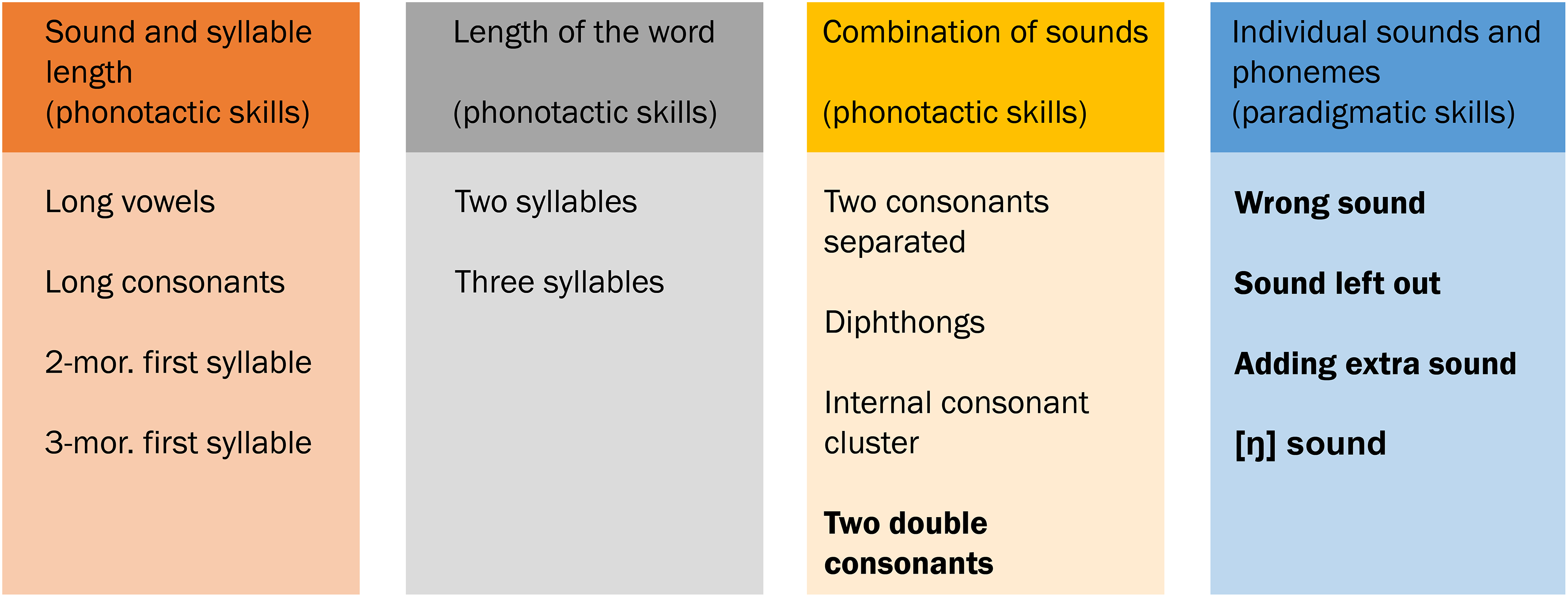 The Phonology test evaluates two types of phonetic skills: phonotactic and paradigmatic skills. The evaluation of phonotactic skills includes: 1) the length of sounds and syllables (double vowels and consonants) and short and long (two- and three-moraic) first syllables; 2) the length of words (two- and three-syllables); and 3) combination of sounds (separate consonants in a word, diphthongs, and combinations of consonants). Paradigmatic skills are evaluated but not scored, and include articulation of individual phonemes (consonants at different positions in words and vowels).