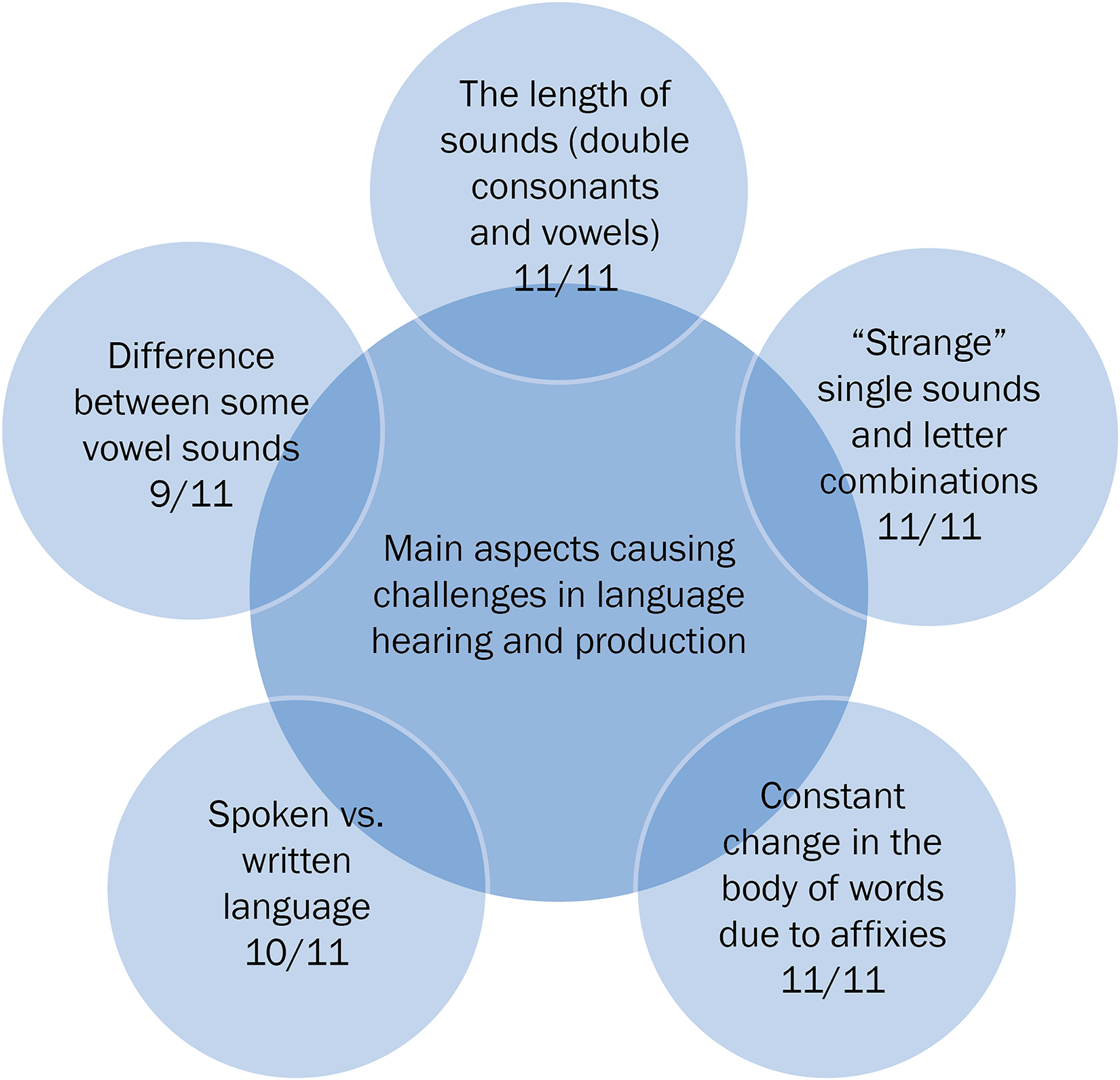 Main aspects causing challenges in hearing and producing Finnish language reported by the 11 interviewees.
