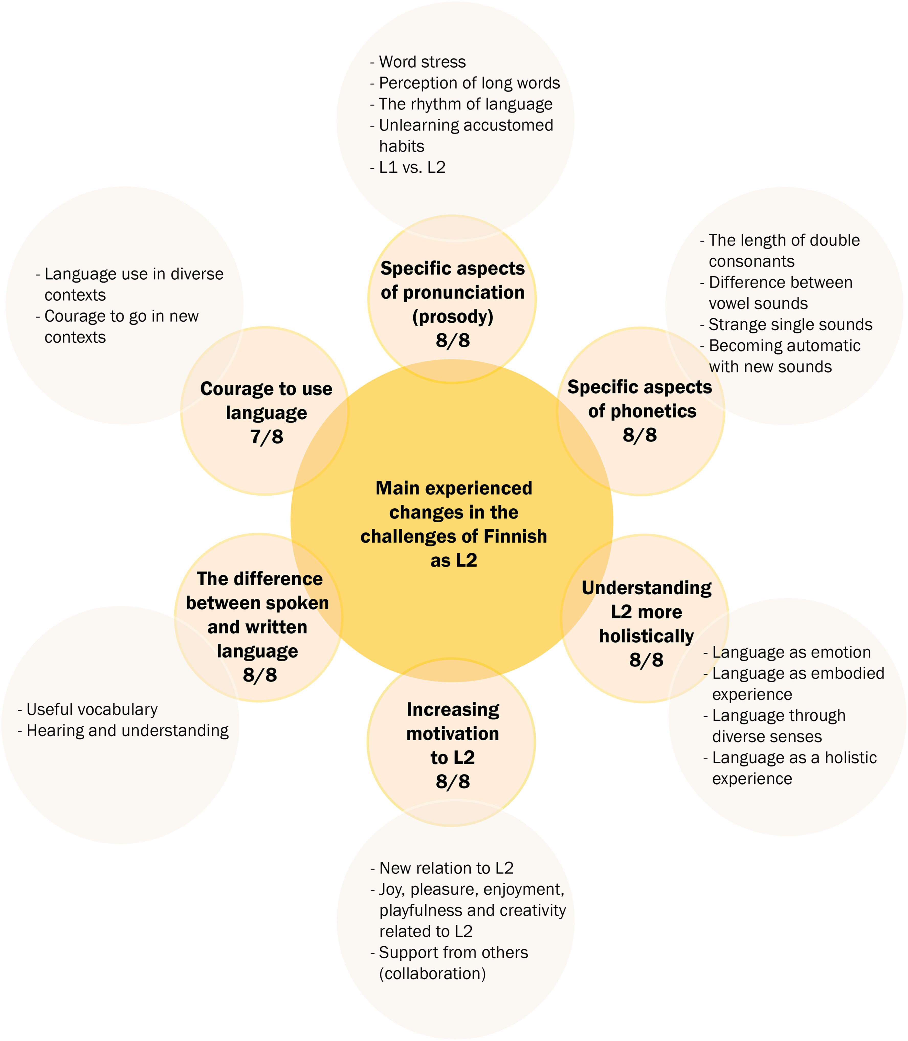 Main experienced changes in the challenges of Finnish as L2 reported by the eight interviewees. Both the main and subthemes are presented in the figure.