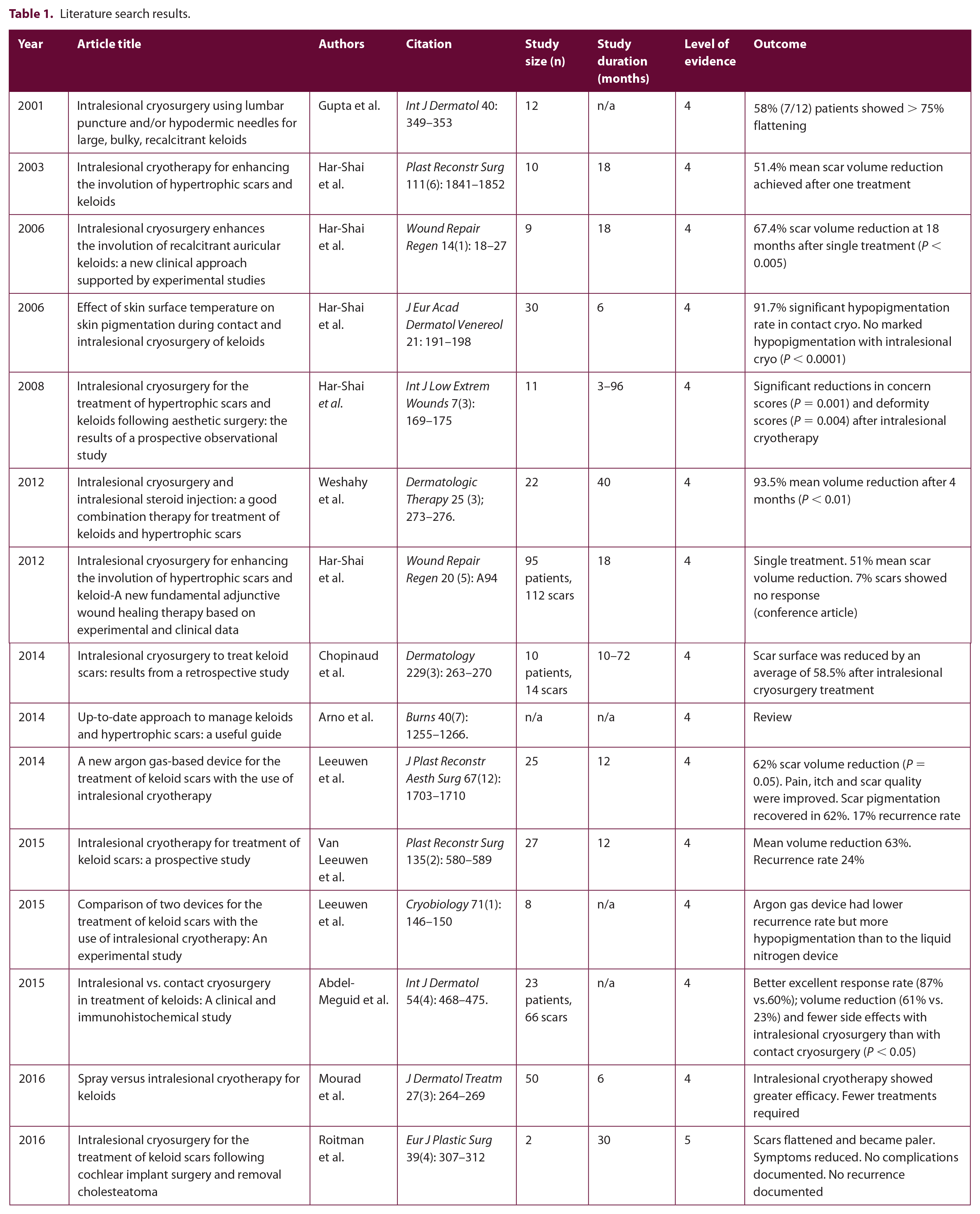 Ovid Embase was searched using the following parameters: (intralesional AND cryotherapy AND keloid) OR (intralesional AND cryotherapy AND hypertrophic) OR (intralesional AND cryosurgery AND keloid) OR (intralesional AND cryosurgery AND hypertrophic).