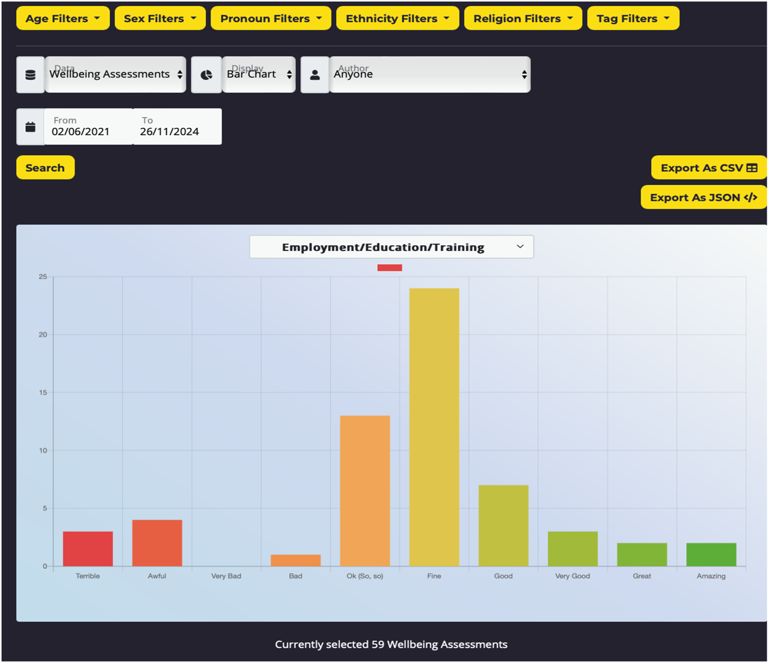 The data can be displayed as bar, pie and line graphs and exported from the app in comma-separated values (CSV) (for Microsoft Excel) and JavaScript Object Notation (JSON) (for machine learning) format for further analysis. The data can be used for more strategic purposes to identify emerging needs with members that require additional resources or to evidence the need/use of the service.