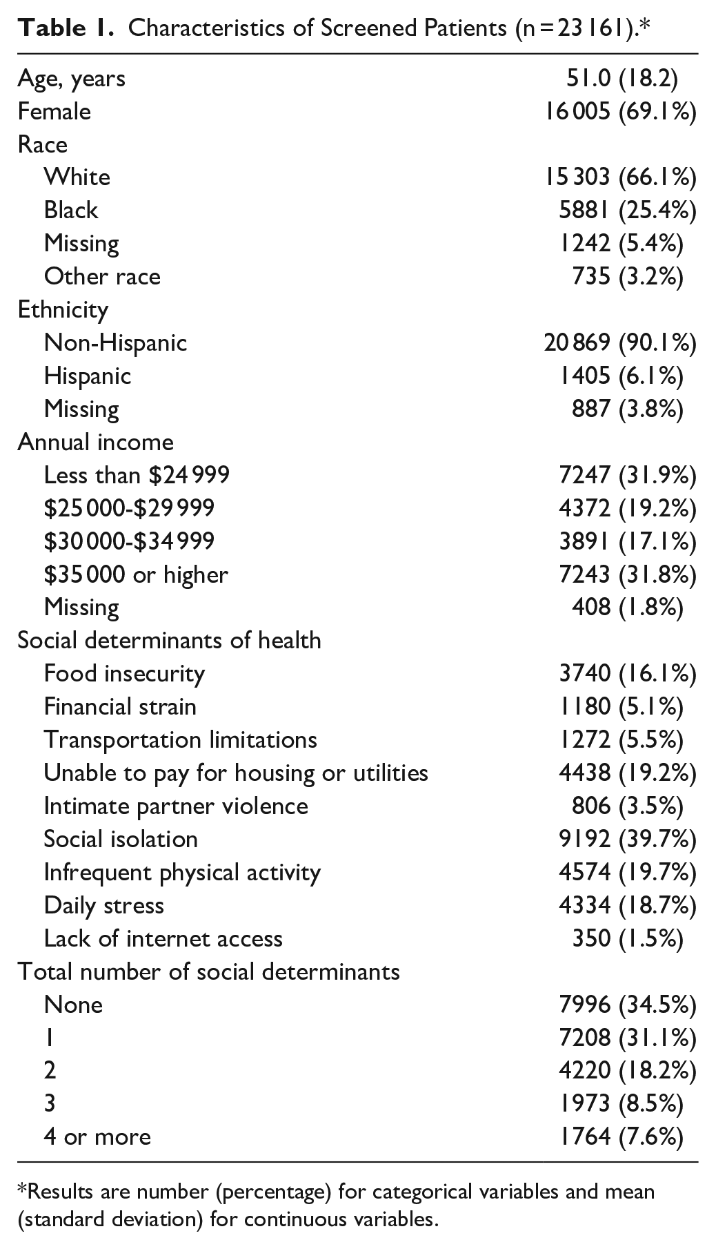 A total of 23 161 patients completed the screening questionnaire during the study period. The mean age of screened patients was 51 years, a majority were female, and most were White or Black (Table 1). The most common social determinants of health were social isolation, infrequent physical activity, and inability to pay for housing or utilities. Of the 23 161 patients, 34.5% had no social determinants of health, 31.1% had only one determinant, 18.2% had 2 determinants, 8.5% had 3 determinants, and 7.6% had 4 or more determinants.