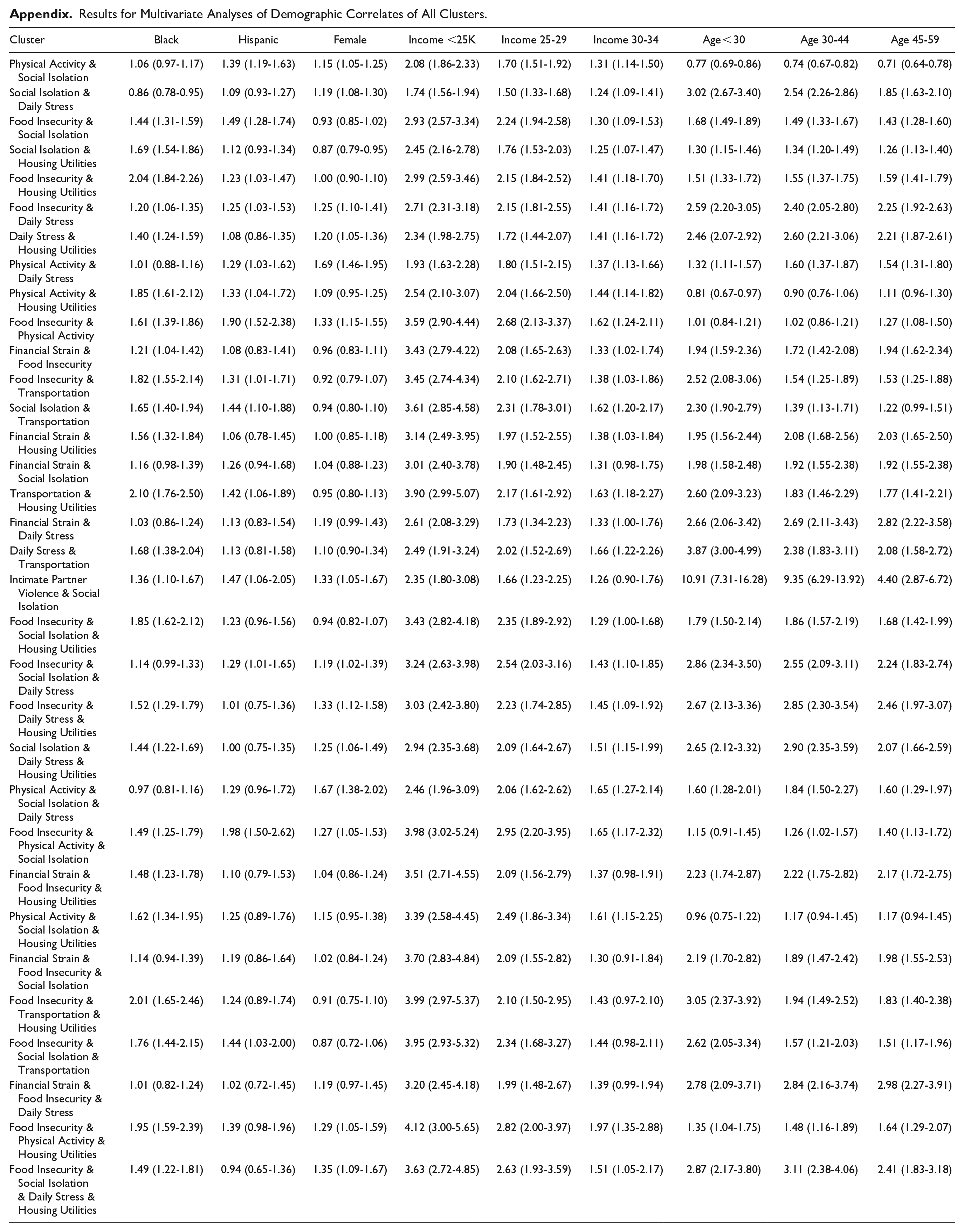 | Food Insecurity & Social Isolation & Daily Stress | 1.14 (0.99-1.33) | 1.29 (1.01-1.65) | 1.19 (1.02-1.39) | 3.24 (2.63-3.98) | 2.54 (2.03-3.16) | 1.43 (1.10-1.85) | 2.86 (2.34-3.50) | 2.55 (2.09-3.11) | 2.24 (1.83-2.74) |