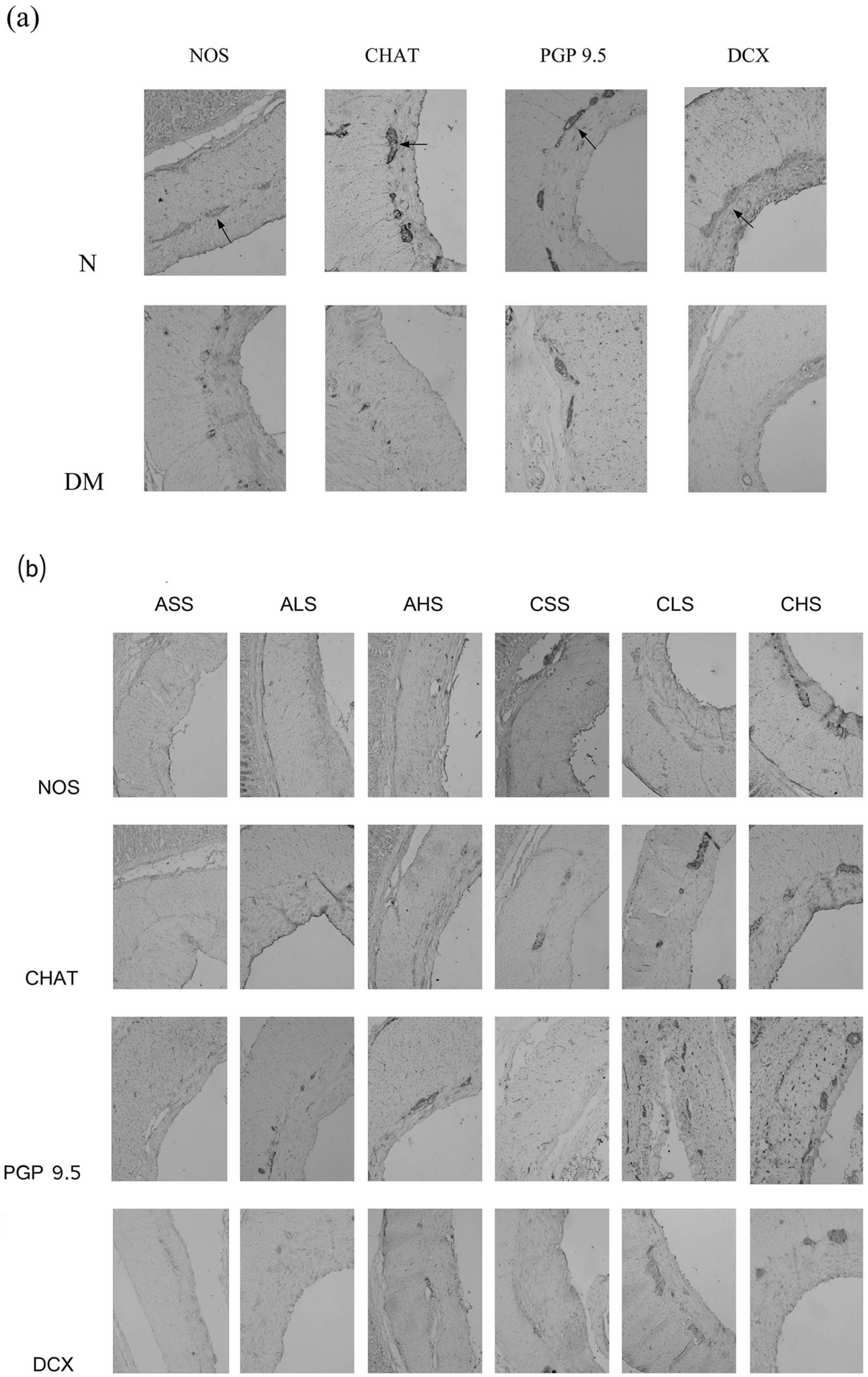 The protein expression of nNOS, CHAT, PGP9.5, and DCX