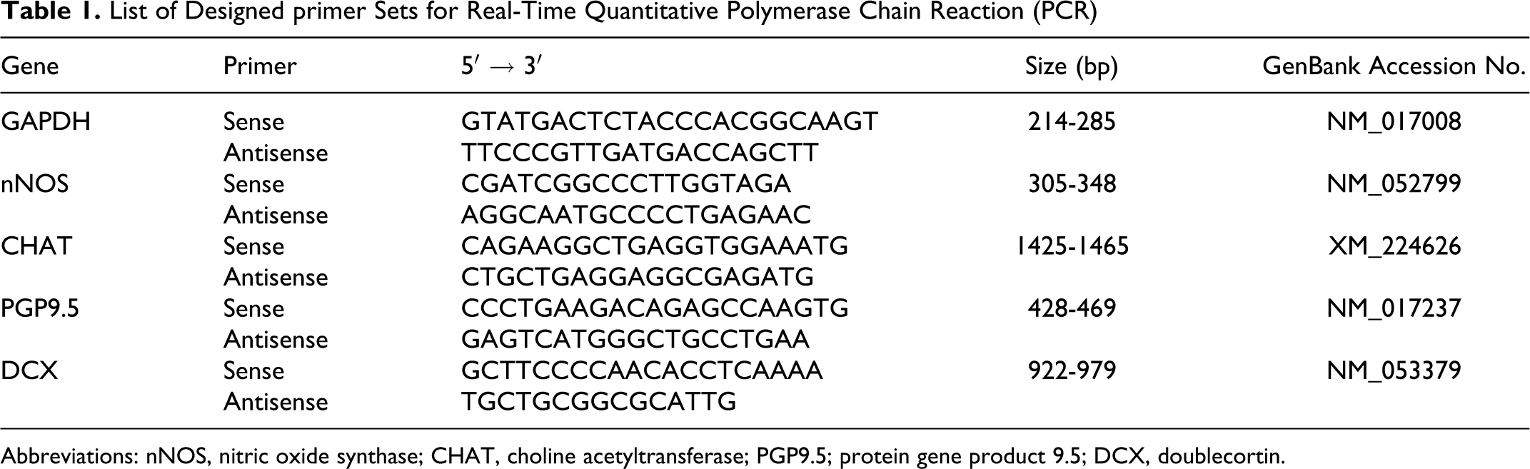 In the current study, we used the following materials: primary antibodies to nNOS (Abcam, Cambridge, UK), CHAT (Chemicon International, Temecula, CA), PGP9.5 (Abcam, Cambridge, UK), doublecortin (Abcam, Cambridge, UK), and mouse anti-rat actin (Boster, Wuhan, China). Secondary antibodies for Western blot include horseradish peroxidase (HRP)-linked goat anti-rabbit IgG, HRP-linked goat anti-mouse IgG, and HRP-linked mouse anti-goat IgG (Boster, Wuhan, China); anti-mouse Histostain-plus Kit, anti-rabbit Histostain-plus Kit and anti-goat Histostain-plus Kit (MAIXIN, Fuzhou, China).
