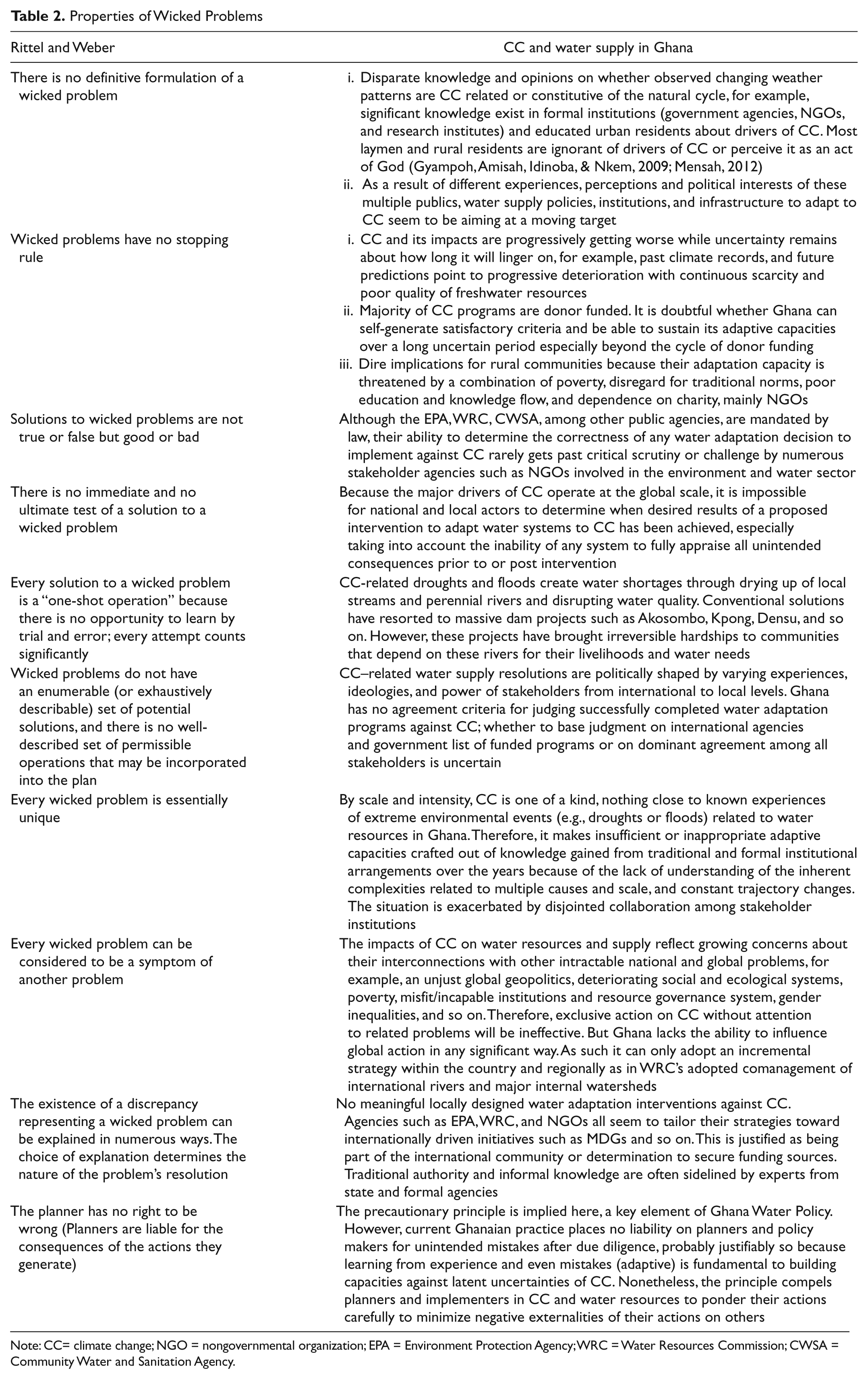 Table 2 provides a comparative analysis of Ritter and Weber’s (1973) characteristics of wicked problems and the extent of their manifestation in climate change vis-à-vis water management in Ghana. It explicates the complex relationship between climate change and water resource management in Ghana because of multiplicity of causal factors, actors and views involved, as well as scale concerns. Institutional reforms (i.e., decentralization and water governance) have the potential to improve our understanding of the relationships between water supply and impacts of climate change. However, the current practices exhibit low adaptive capacities, which result from weak collaborative linkages among institutions, and do not foster the requisite learning to enable rural communities to effectively respond and adapt their water resources to climate change (Mensah, 2012). Ghana, therefore, needs an approach that can reasonably respond to climate change and related complexities in water management.