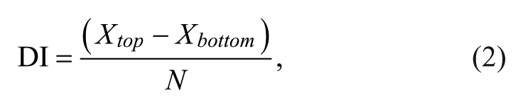 This parameter has values in the range of +1 to −1. Its meaning should be interpreted as follows: When DI is getting greater than 0.0, more low-performance students have been assumed to be better in this item than students with higher performance. Therefore, these items, as questions for evaluation, should be eliminated for being inadequate. In fact, these items reduce the global score precision of the test.
