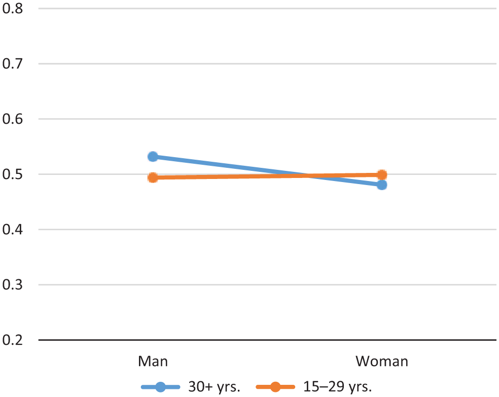 According to Table 1, men value work more than women do. Here, however, we find an interesting interaction effect concerning age. Whereas younger men value employment less than older male employees, the quite opposite holds for younger women: Older female employees respect work less than their younger colleagues. At the same time, between young men and women, the gender difference does not exist (Figure 3).