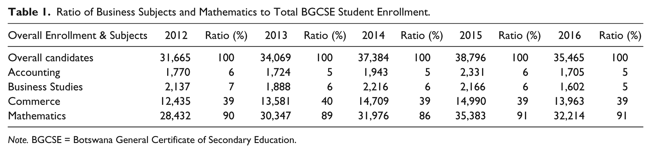 The Botswana General Certificate of Secondary Education (BGCSE) curriculum came about as a result of the localization of the Cambridge Overseas School Certificate starting in 1999. This was in fulfillment of the recommendation of the second National Commission on Education of 1993 and the Revised Policy on Education of 1994, which called for final examinations at senior secondary school level to be graded in Botswana and not Britain as it had been the case since Botswana’s independence in 1996, and a vocationalization of the curriculum at secondary level through the introduction of practical subjects among other things (Weeks, 2002). The BGCSE have two major facets: Group 1 entailing core subjects (English, Setswana, and mathematics), and optional subjects group which are further classified into sciences, humanities and social sciences, creative, technical and vocational, and enrichment subjects (Republic of Botswana, 1998). Business subjects’ localized syllabi, falling under the subgrouping of practical subjects or creative, technical, and vocational group, were thus developed, consisting of three subjects, namely, accounting, business studies, and commerce.