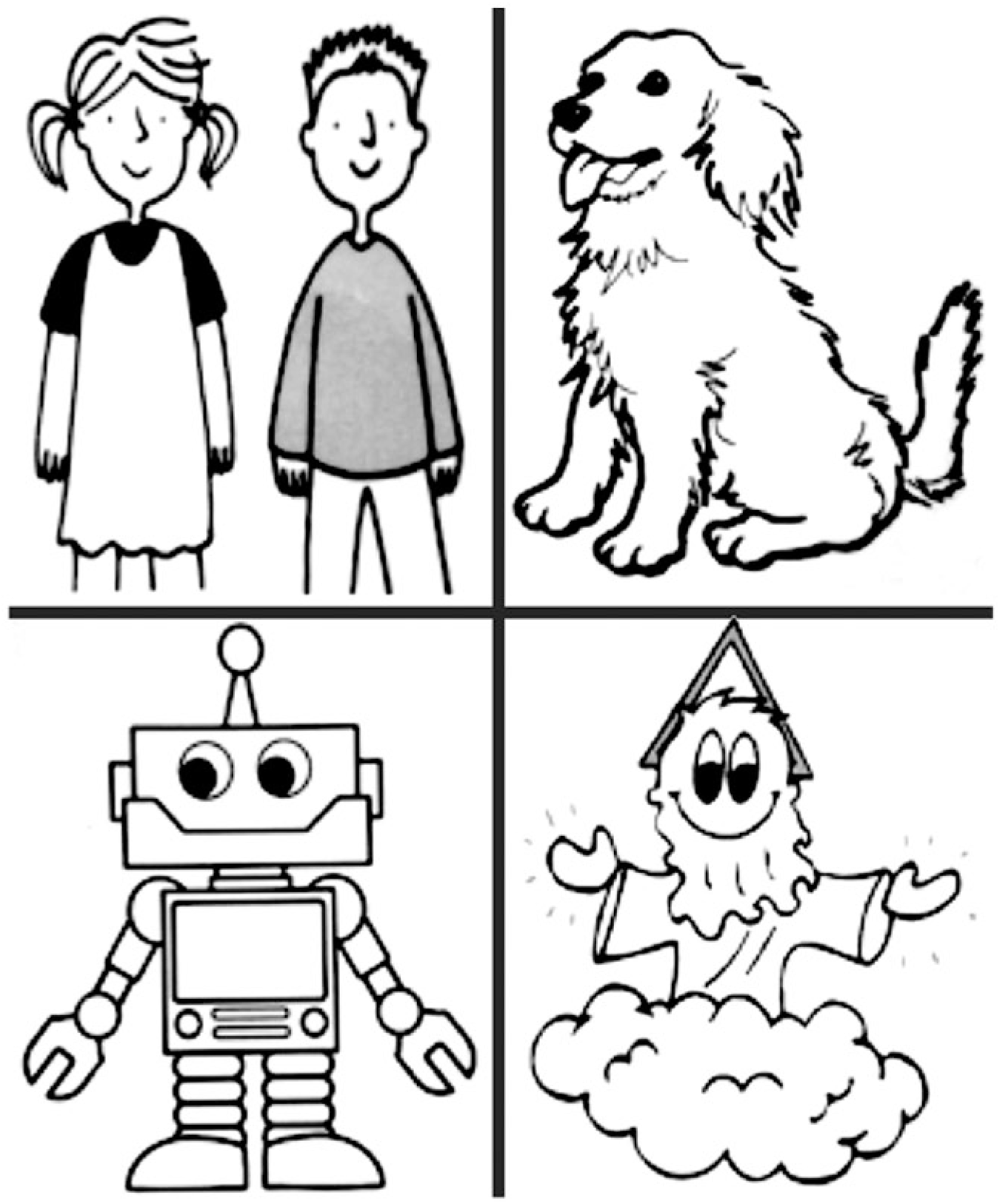 Stimuli used in the recognition test: Female or male child (top left) according to the participant’s gender, dog (top right), robot (bottom left), and God (bottom right).