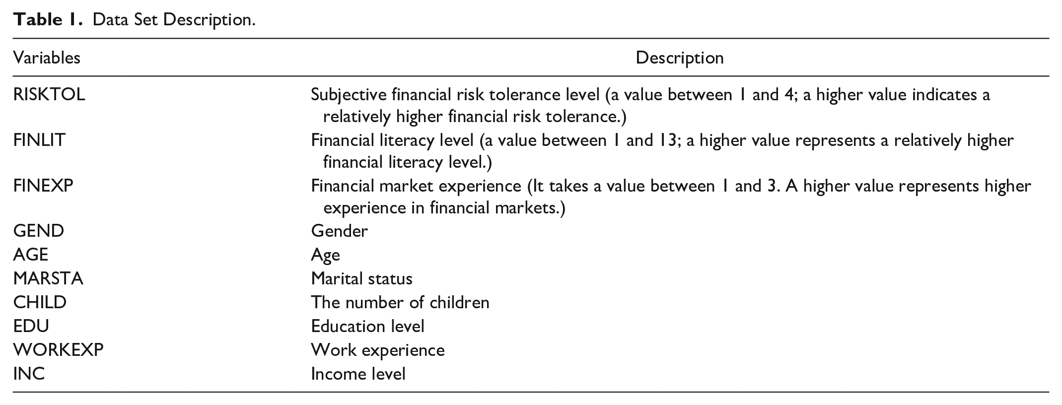 The subjective financial risk tolerance of the participants (RISKTOL) in the study was identified by a question that can be weighed between 1 (