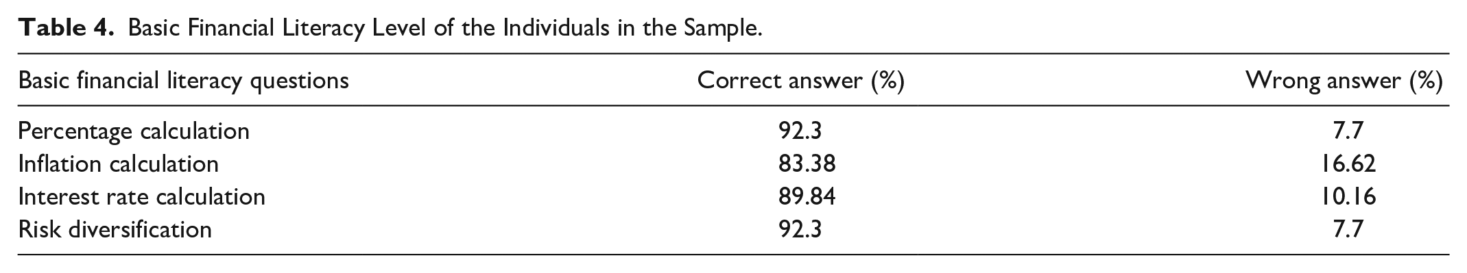 Within the scope of identifying the financial literacy levels of the participants, first, basic financial literacy levels of the individuals in the sample were measured through the questions including percentage, inflation, and interest calculations; the results are presented in Table 4. The results indicate that the basic financial literacy levels of the individuals are very high and the correct answering rate of each question is above 80%.