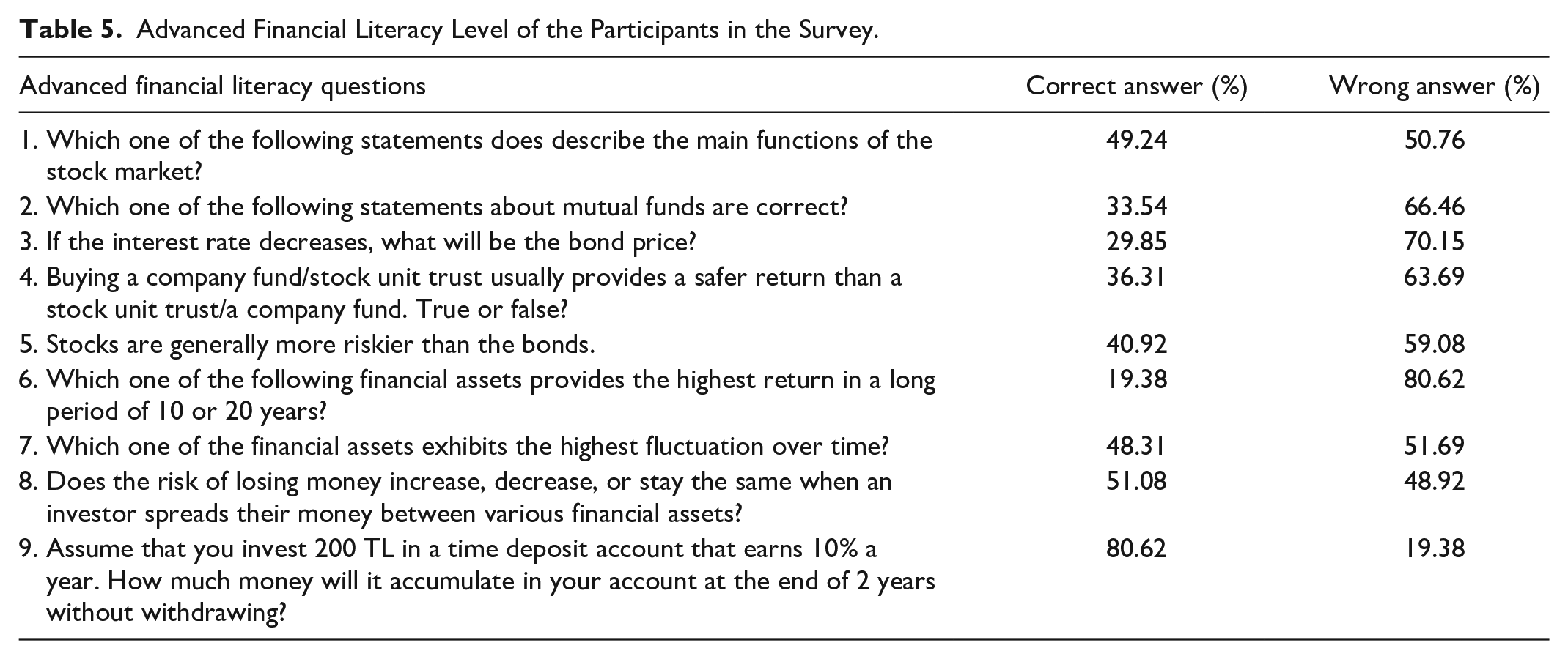 In the second stage, the advanced financial literacy levels of the individuals were measured by the questions shown in Table 5. The lowest correct answering rate, of 19.38%, was observed for the question on financial assets providing relatively higher returns in the long term, while the second lowest rate, of 29.85%, was observed in the question about the interaction between bond prices and interest rate. In addition, approximately one third of the individuals in the sample answered the questions about investment funds correctly. Furthermore, approximately half of the participants answered the questions about stock market and risk diversification correctly. Finally, approximately 80% of the participants correctly answered the question about compound interest calculation.
