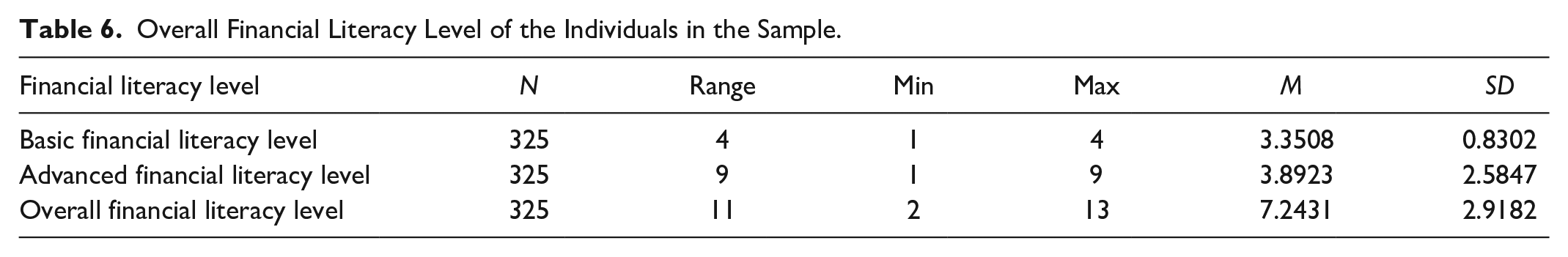 By adding the basic and advanced financial literacy levels, overall financial literacy levels were calculated in the study and are shown in Table 6. The basic financial literacy level of the individuals was identified as 3.35 out of 4. Therefore, the participants have a high knowledge level about interest rates, inflation, and percentage calculation. However, the advanced financial literacy level of the individuals was calculated as 3.89 out of 9 on average. Therefore, the participants are at an intermediate level in advanced financial literacy. In addition, the overall financial literacy level of the participants was calculated as 7.24 out of 13 on average. Increases in the overall financial literacy level are partly derived from the relatively higher basic financial literacy scores.