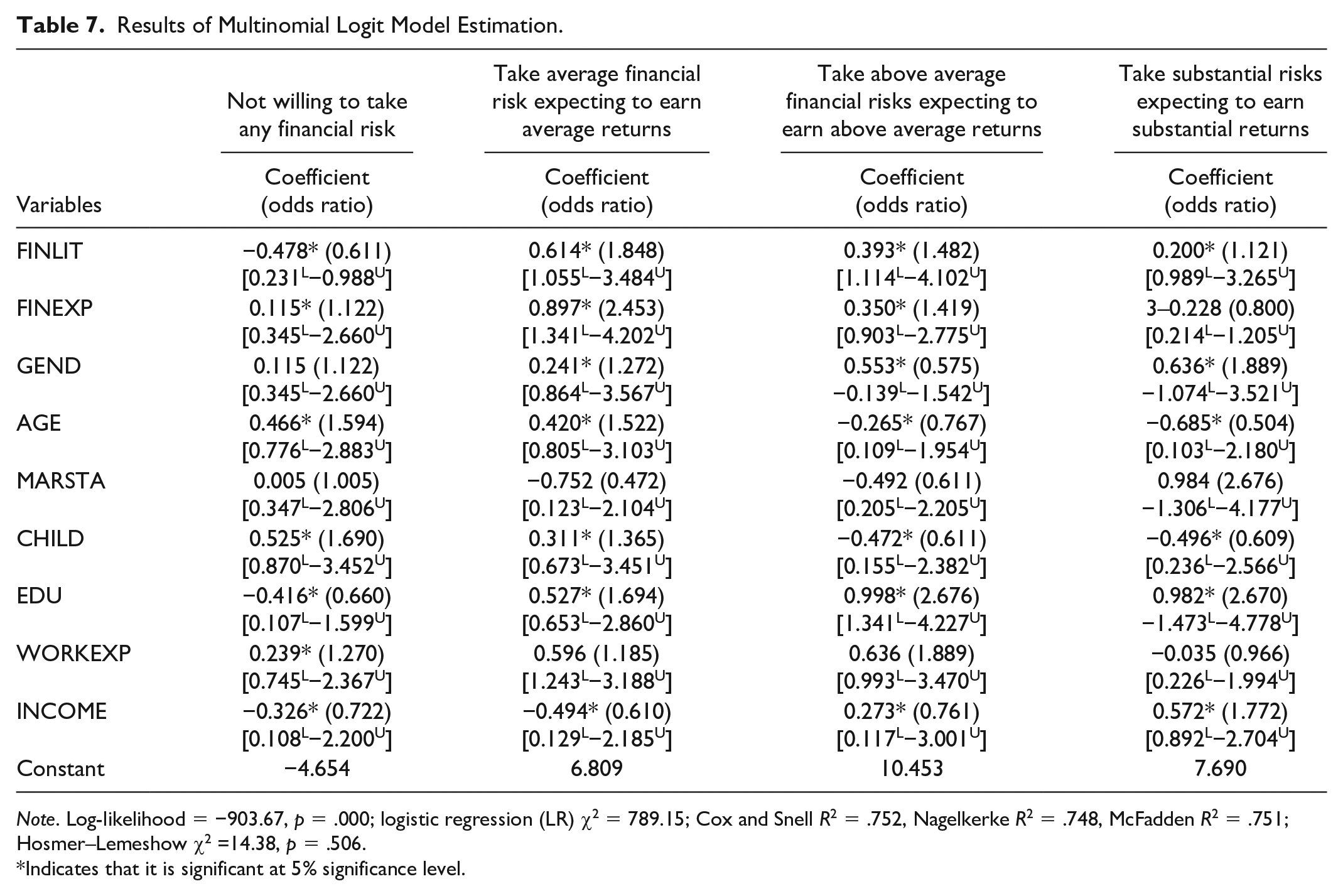 The impact of financial literacy level and demographic characteristics on the risk tolerance of individuals was analyzed through multinomial logistic regression and the results of the analysis are presented in Table 7, illustrating that the Cox and Snell