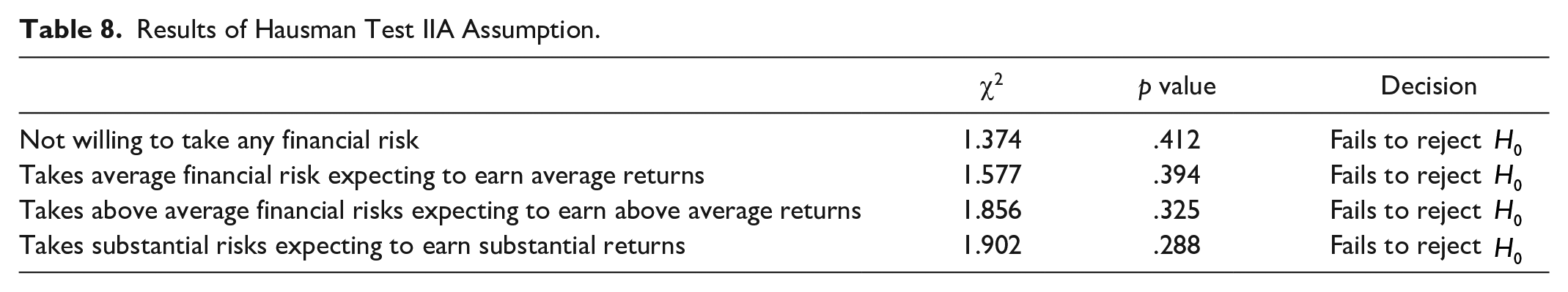 In addition, IIA hypothesis in the Hausmann test was proved and the model results are reliable (Table 8). The model goodness of fit is proved.