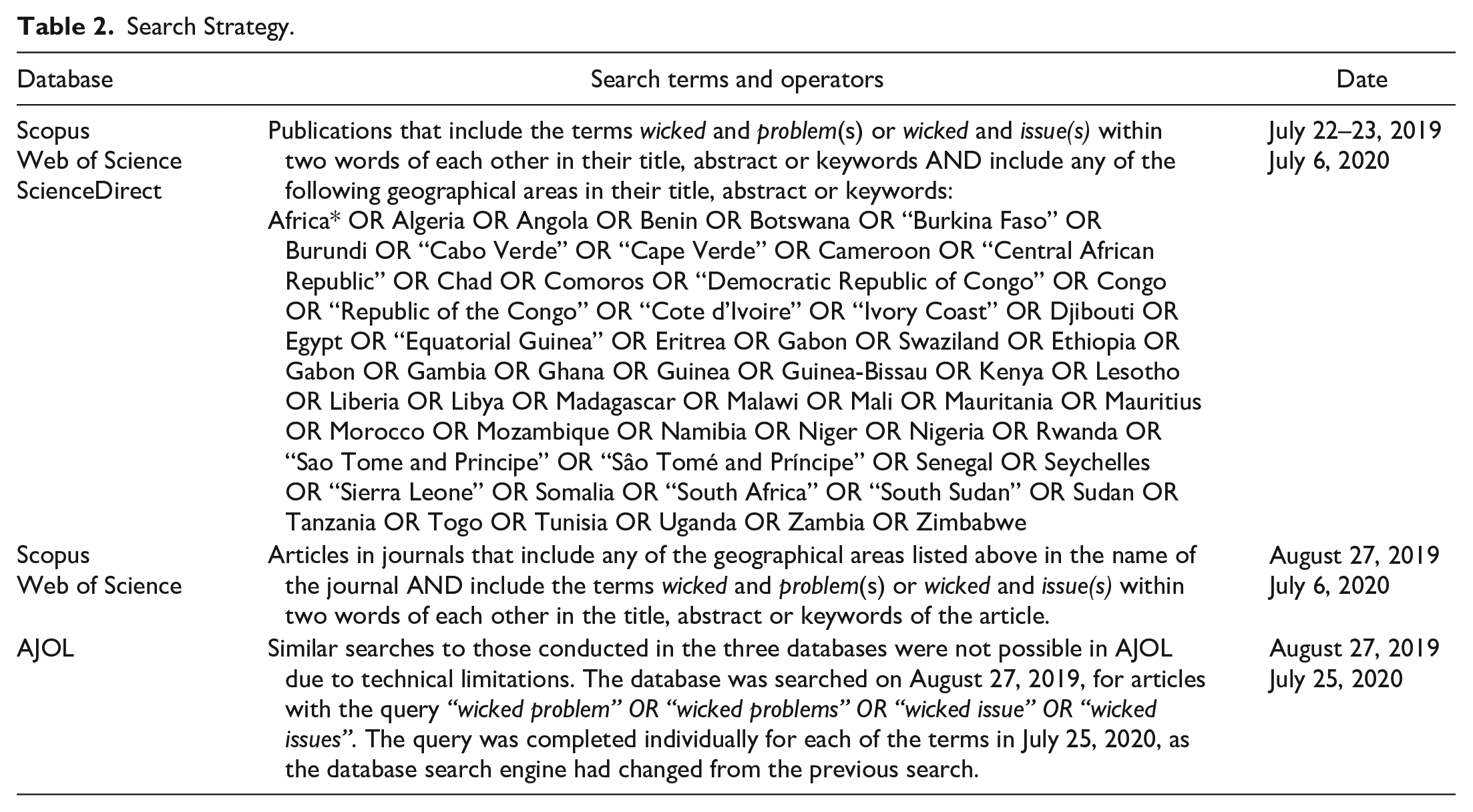 Similar searches to those conducted in the three databases were not possible in AJOL due to technical limitations. The database was searched on August 27, 2019, for articles with the query “wicked problem” OR “wicked problems” OR “wicked issue” OR “wicked issues”. The query was completed individually for each of the terms in July 25, 2020, as the database search engine had changed from the previous search.