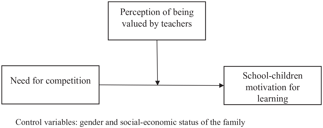 We used IBM SPSS Statistics version 21 to test the association between main variables and the Process macro v.3.1. to test for interaction effects and to estimate the power of the moderator. To avoid multicollinearity with the interaction term, the variables were mean centered for the product term (i.e., perception of being valued by teachers). Following the literature and main guidelines for analyzing the impact of the perception of being valued in the class by the teachers we: (a) illustrate the associations between the main variables included in the study, (b) tested the impact of perception of being valued by teachers within the association between the need for competition with motivation for learning and by accounting for gender and socio-economic status as control variables. The tested model in the current research is represented in Figure 1 below.