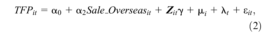 Second, based on cross-border e-commerce promoting internationalization, this study examines whether SMEs experience an improvement in TFP in the process of internationalization. If the productivity effect is significant, it indicates that the quality of internationalization is high and the increase in overseas business revenue promoted by cross-border e-commerce is due to the improvement of international competitiveness. Accordingly, the following panel regression model was used.