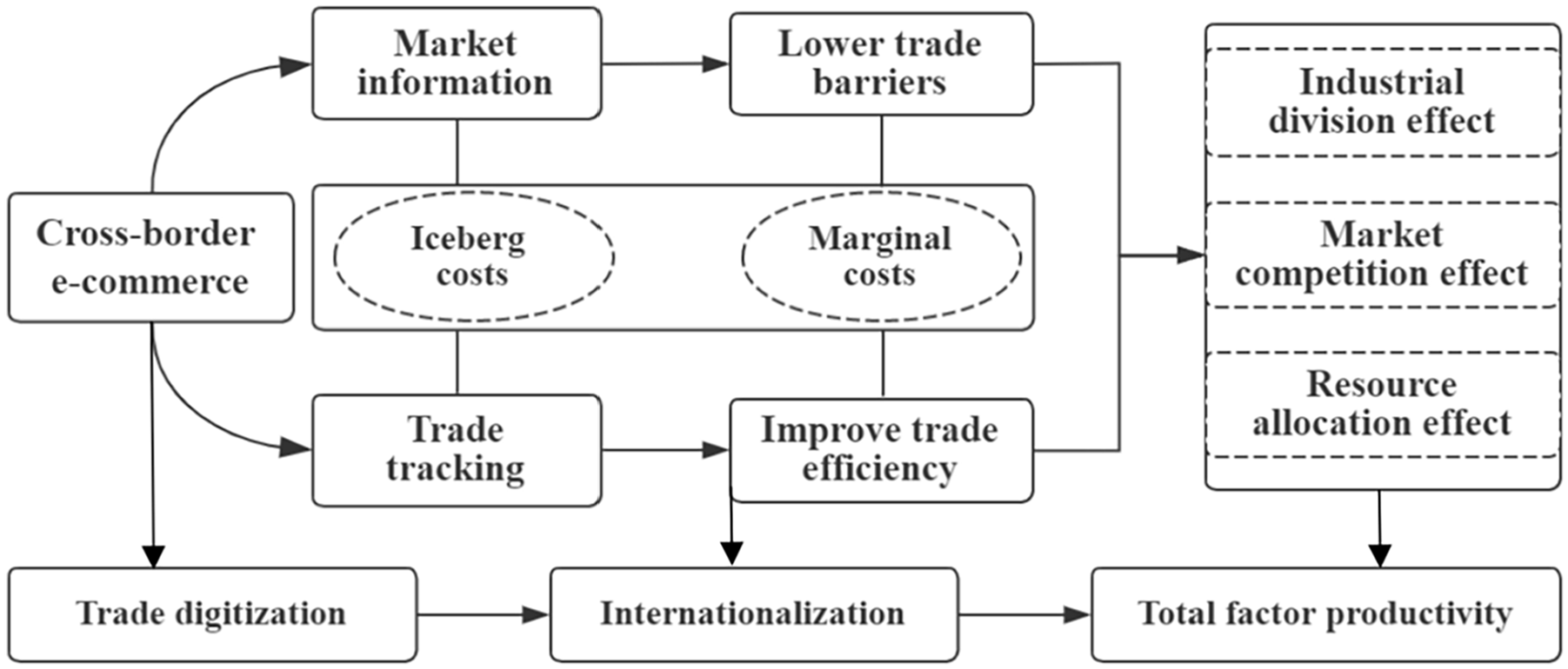 Existing literature shows that information technology brings new processes, structures, and paradigms to international business, thus constituting the most important driving force for global economic integration (Alcácer et al., 2016). Classical international trade theory shows that international trade improves both parties’ welfare, but international trade activities need to overcome iceberg costs, such as transportation costs and market development (Alessandria & Choi, 2014). Melitz (2003) proposed the trade theory of firm heterogeneity, arguing that only enterprises with high productivity can overcome iceberg costs and engage in export trade activities. As e-commerce and other Internet platforms can greatly reduce the iceberg and marginal costs incurred by SMEs, they are an important driving force for their internationalization. For example, the development of the Internet has positively impacted export marketing ability and performance in emerging markets (Jean & Kim, 2020). Cross-border e-commerce and other digital trade platforms provide platform facilities specifically for the internationalization of SMEs. Some studies have focused on the vital role of digital trade in global economic and trade cooperation (Jiang et al., 2022), whereas few have empirically investigated the role of digital trade in SME internationalization and competitiveness improvement.