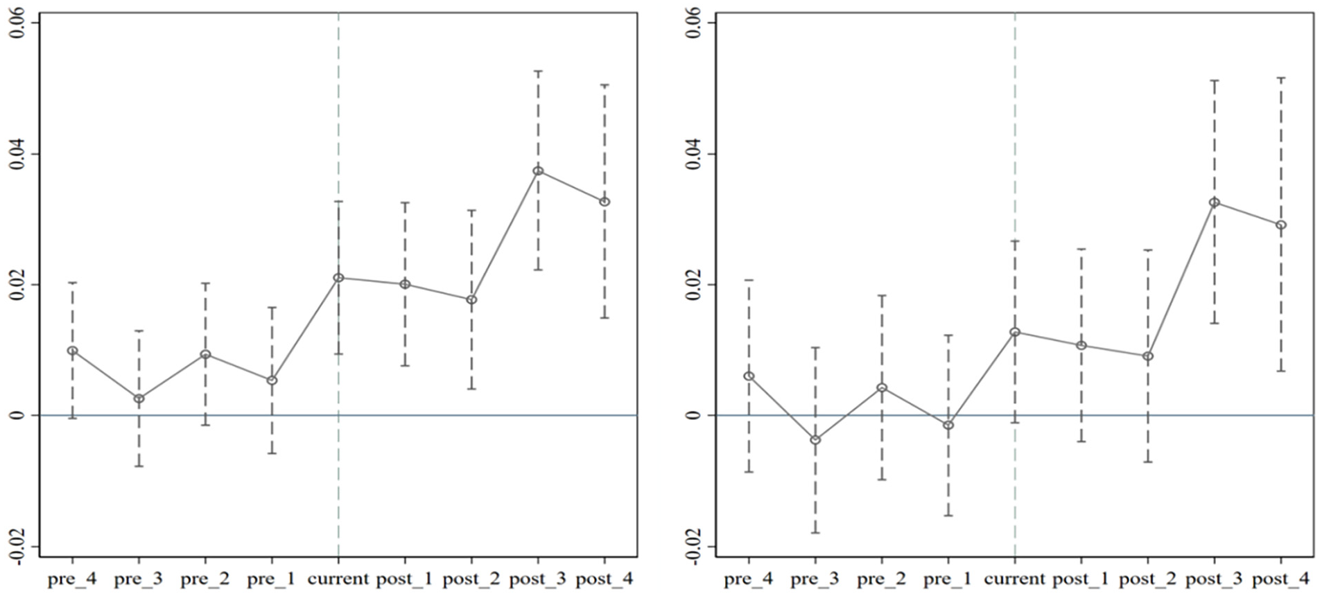 The internationalization development of the two groups of SMEs before the policy intervention satisfied the parallel trend, a prerequisite for applying the DID design in this study. Figure 1 shows the test results for parallel trends in corporate internationalization; the left panel does not control for other factors that affect internationalization, whereas the right panel controls for other factors. There are differences between the estimates in the left and right panels; however, both groups of firms generally satisfy the parallel trend hypothesis before policy intervention. In the left panel, the internationalization trends of the two groups of firms show some differences before the policy intervention, but the change in the trend difference is insignificant. In addition, the internationalization of the two groups of enterprises exhibited significant trend differences after policy intervention. The two groups of enterprises in the right panel show no trend difference before the policy intervention and satisfy the parallel trend hypothesis. The policy effect was significantly positive 3 years after the pilot policy for cross-border e-commerce was implemented. The results in Figure 2 suggest that there may be differences in the potential internationalization trends between the two groups of enterprises and that such differences arise mainly from corporate characteristics. Therefore, this study’s DID design should control for other factors that affect enterprises’ internationalization.