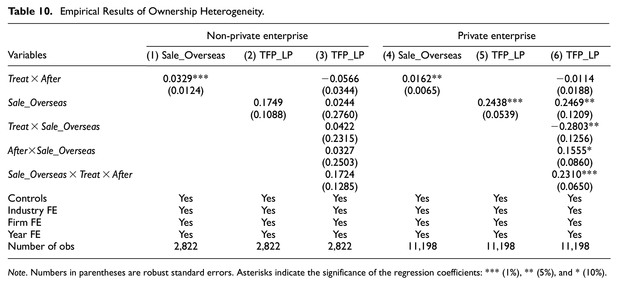 Table 10 shows that cross-border e-commerce promotes the internationalization of private and non-private enterprises but only has a significant promoting effect on the TFP of non-private enterprises in the internationalization process. The coefficients of Treat × After in Column (4), Sale_Overseas Column (5), and Sale_Overseas × Treat × After in Column (6) are all significantly positive at the 1% level, which indicates that Hypothesis 1, 2, and 3 are all established for private enterprises. For non-private enterprises, only the coefficient of Treat × After in Column (1) is significant at the 1% level, while the productivity effect is insignificant. Since international market information circulation is the key mechanism for cross-border e-commerce to act on SMEs, state-owned enterprises and foreign-funded enterprises have a high ability to obtain international market information, which leads to low dependence on cross-border e-commerce for productivity improvement. The empirical results of heterogeneity analysis show that the causal effect between cross-border e-commerce and enterprises’ international competitiveness is real, and unimpeded international market information is the key mechanism for cross-border e-commerce to affect SMEs.