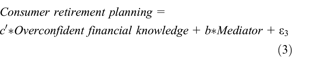 Using the method proposed by Baron and Kenny (1986), this study discusses the influence channels between overconfident financial knowledge and consumer retirement planning. Being identical to H2, this study tests the mediating roles of risk attitude, financial status, and limited attention. The stepwise checks for mediators are as follows: